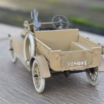 Eens dat gedaan is, kan je de motorkap plaatsen. Je kan in principe deze motorkap half open laten maar voor de stevigheid en de aansluiting met de radiator besloot ik toch maar deze gesloten te houden. De koplampen en de carbuur lampen liet ik achterwege tot het einde. Het voertuig is nu duidelijk herkenbaar en het plaatsen van de stuurkolom met stuur is de volgende stap. Opletten want je moet een onderdeel (regeling handgas) bevestigen op de stuurkolom.