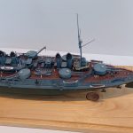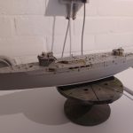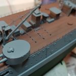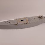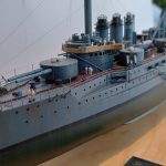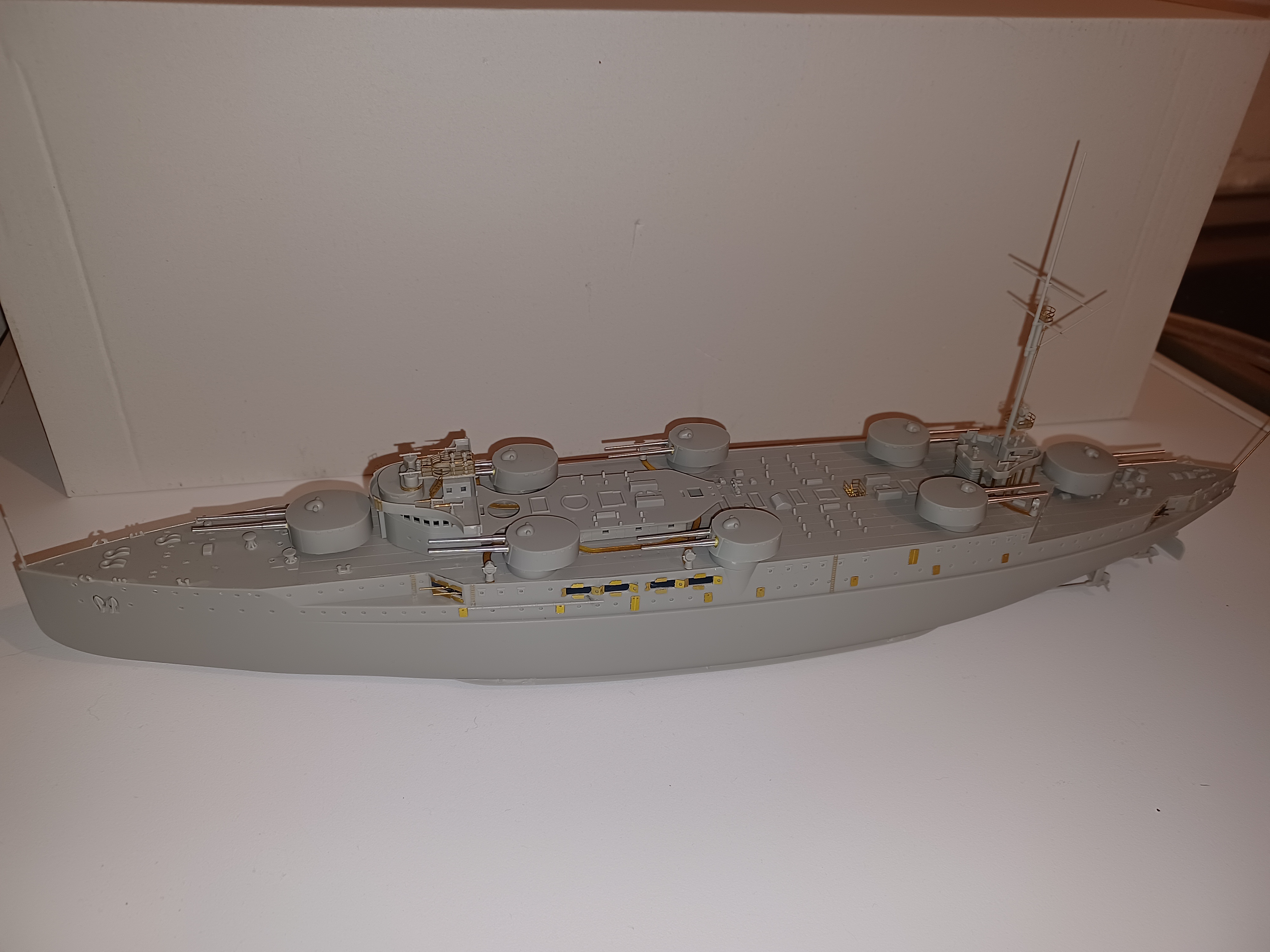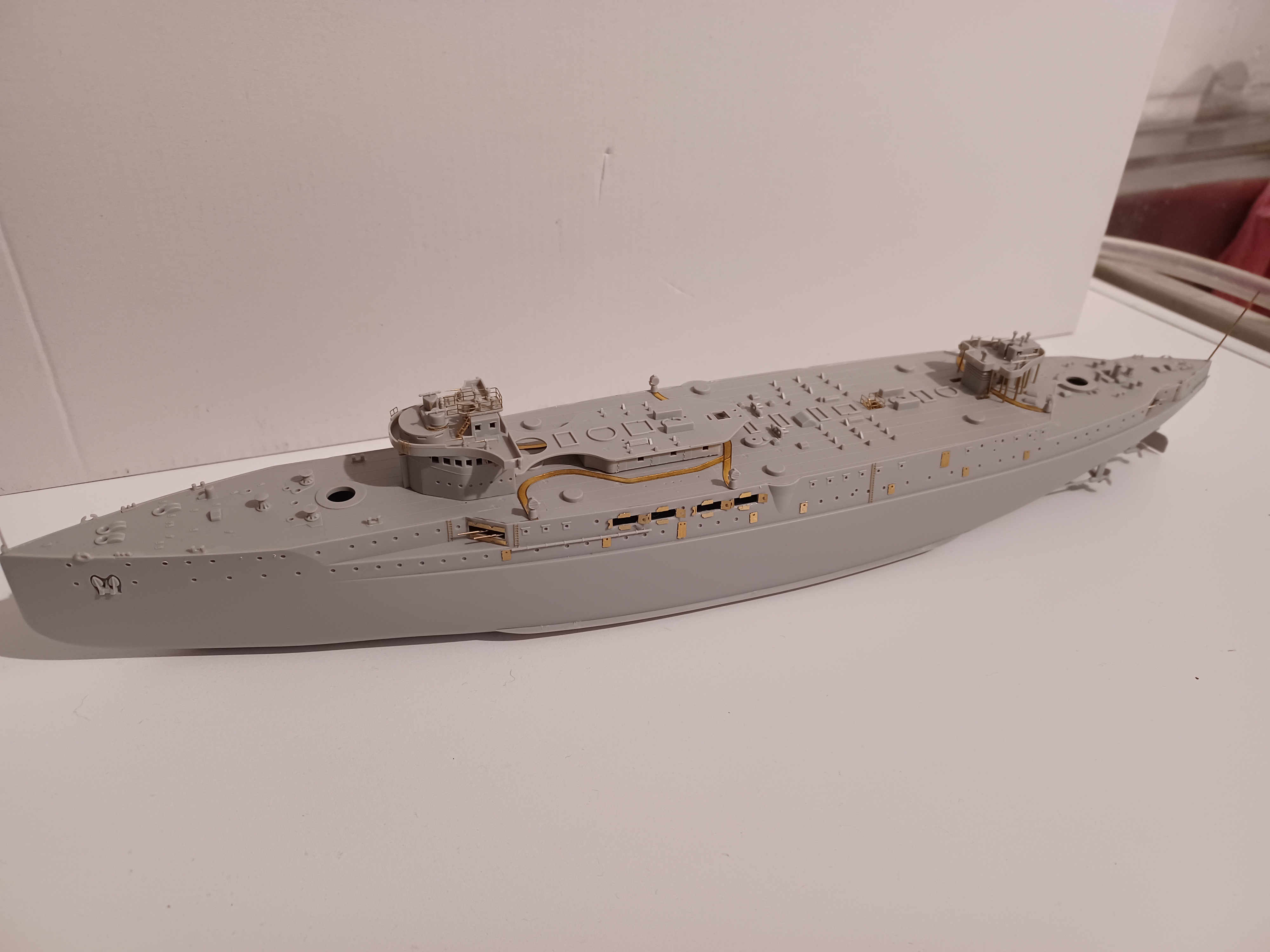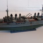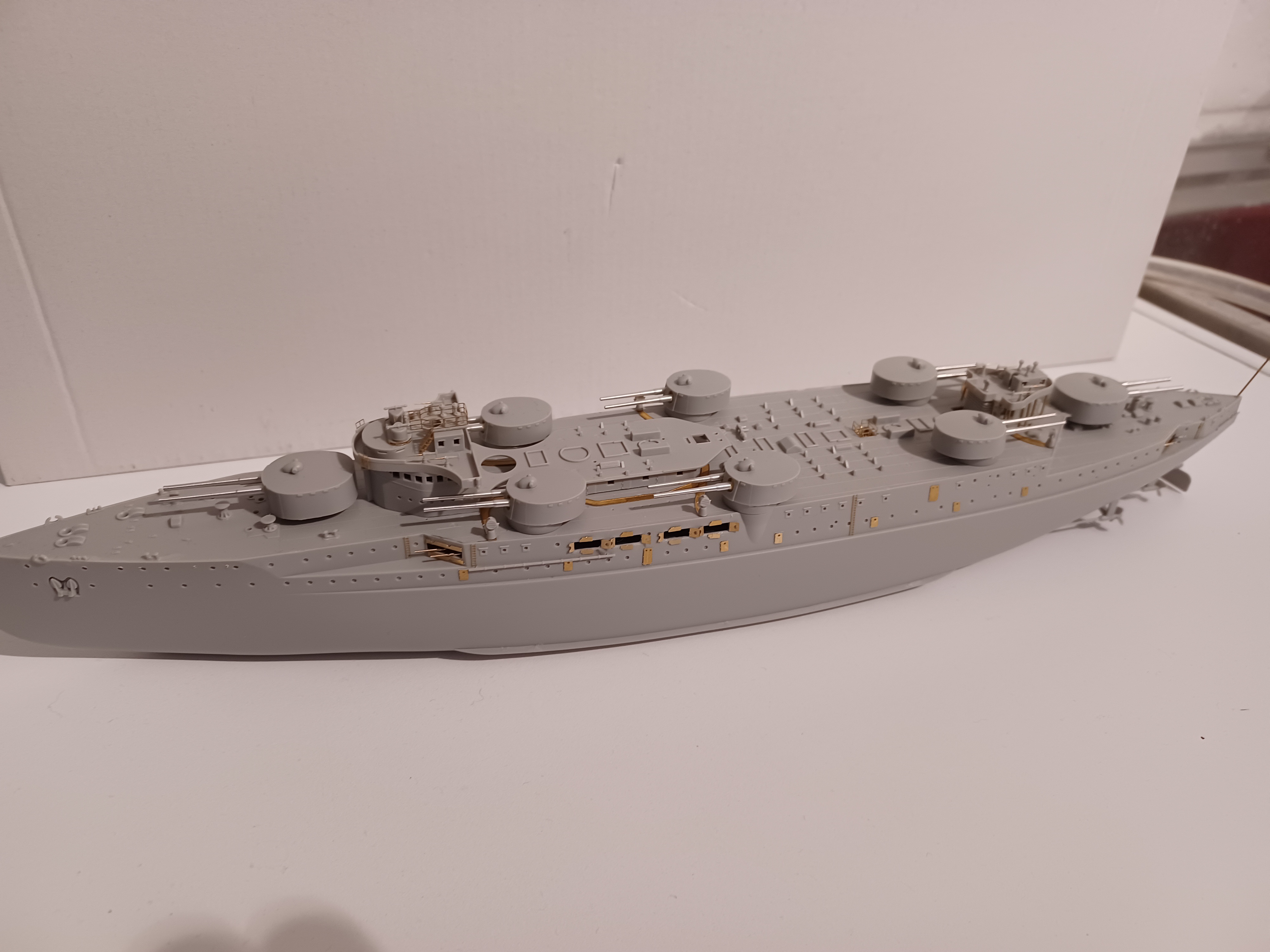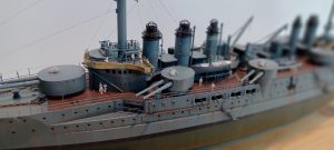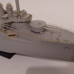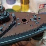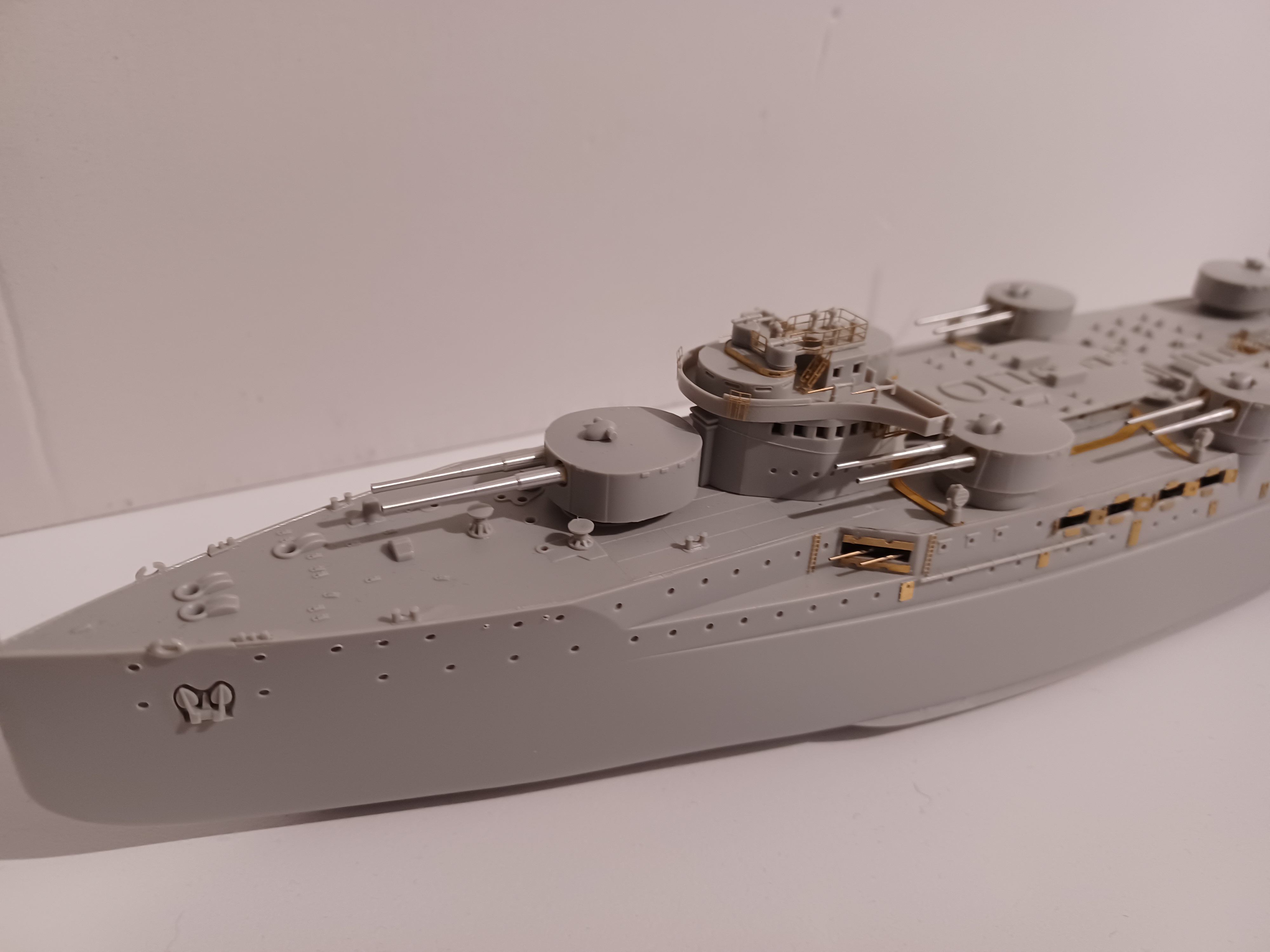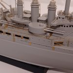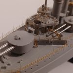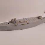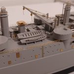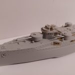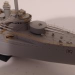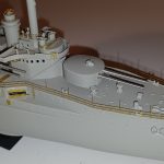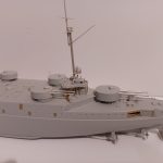 De bouw verliep vlot en extra details worden geaccentueerd door de bijgeleverde PE sets. Niet alle onderdelen werden direct vastgelijmd om in het latere stadium het verven en verweren te vereenvoudigen. Zo schilderde ik de schoorstenen, reddingsboten en geschutstorens apart en werden deze maar op het einde toegevoegd. Zelfs ongeschilderd ziet het model er al indrukwekkend uit met alle PE en de metalen lopen.