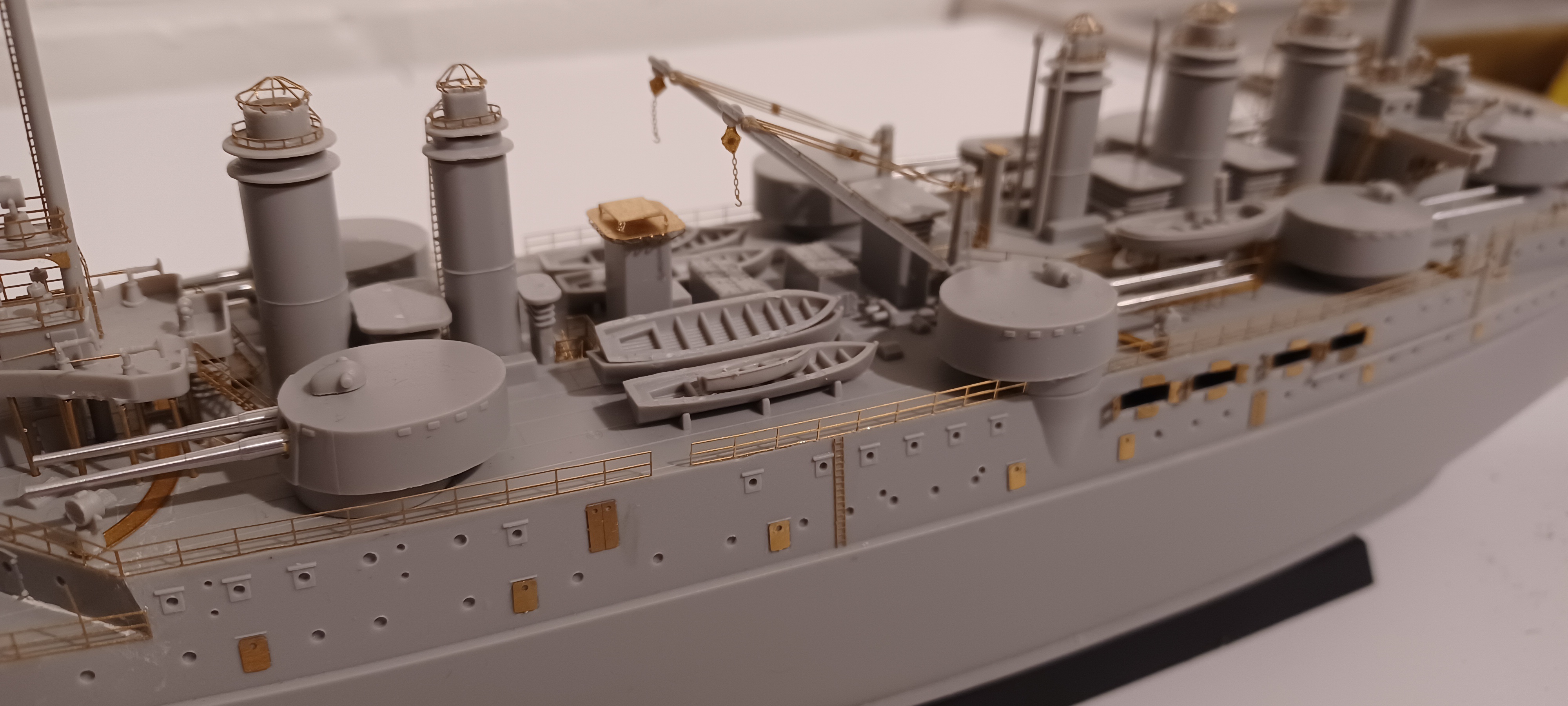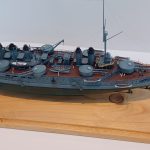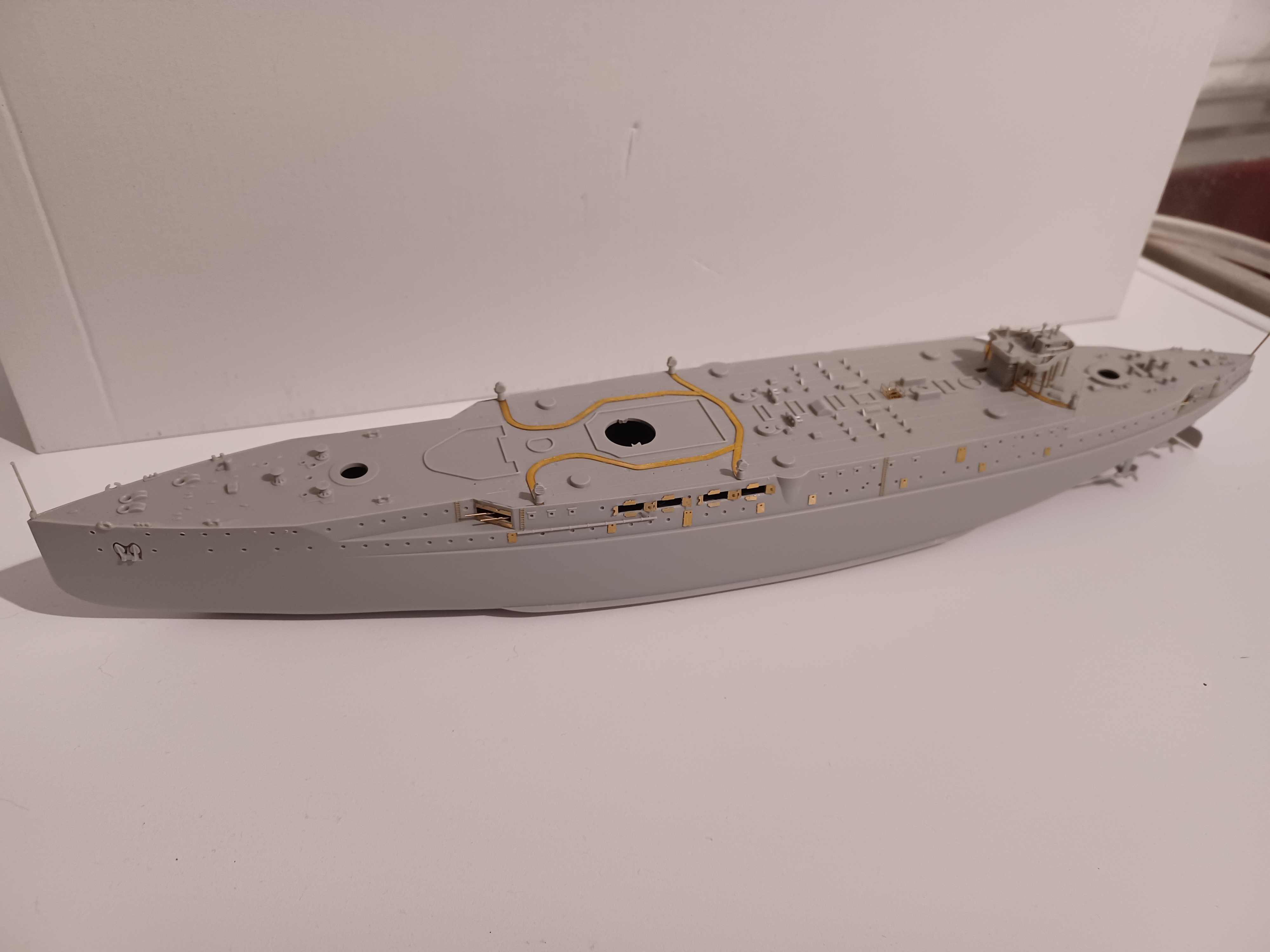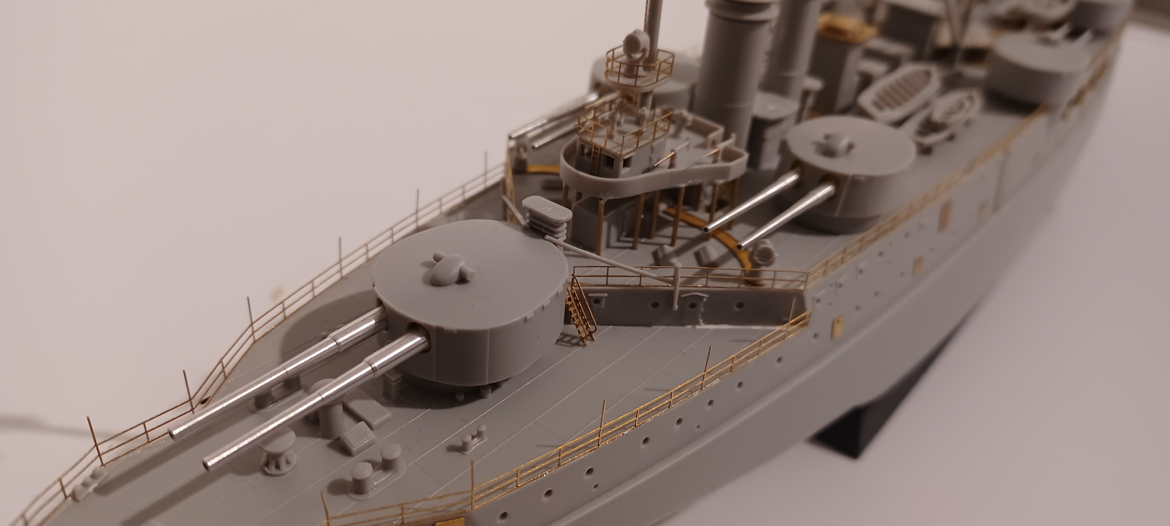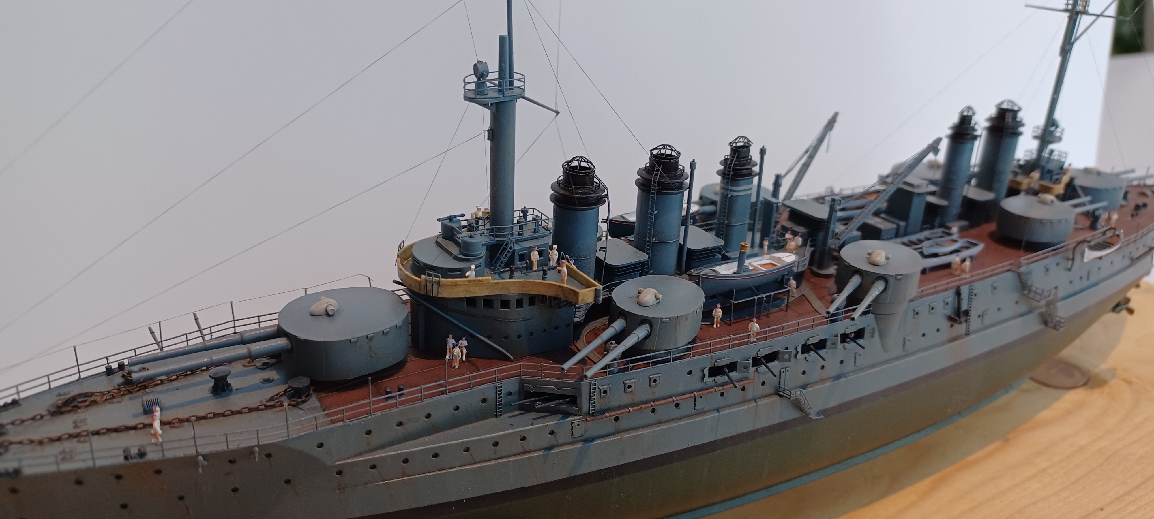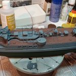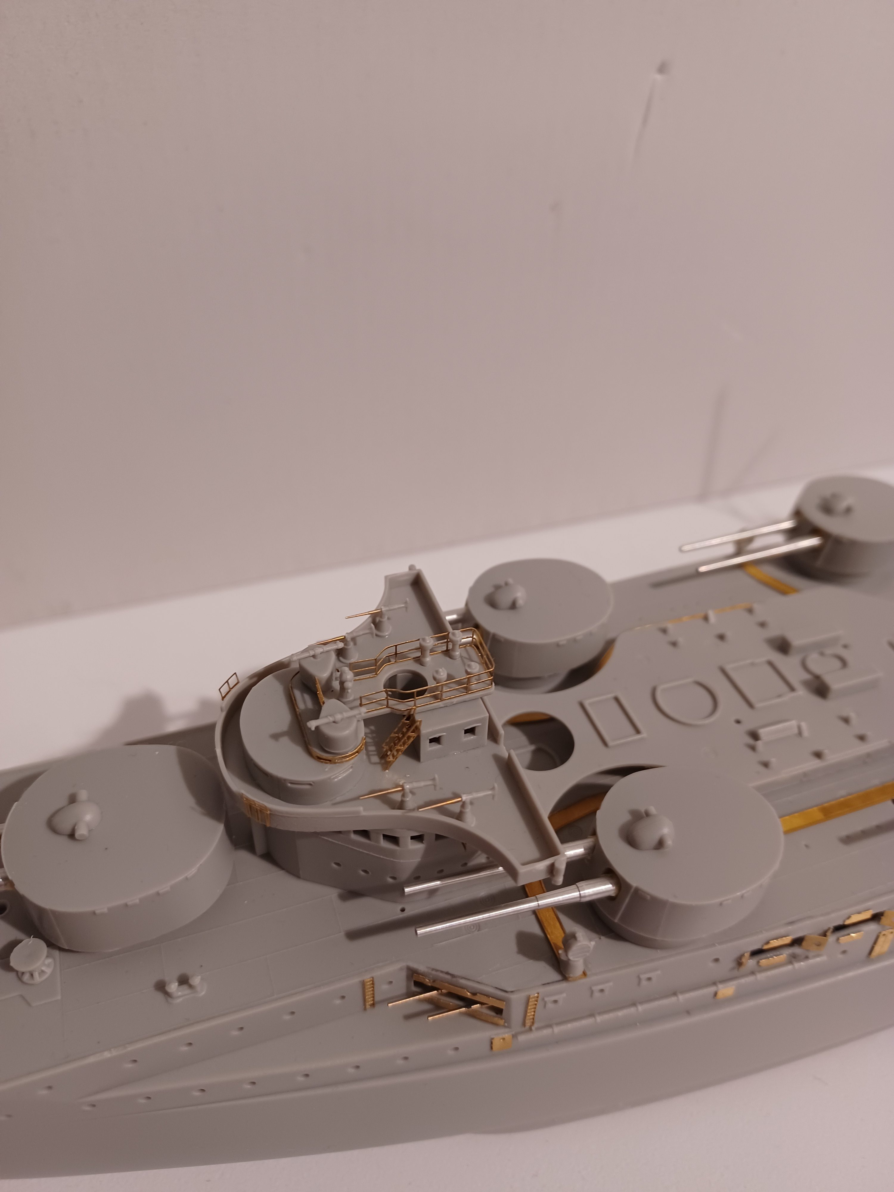 De bouw verliep vlot en extra details worden geaccentueerd door de bijgeleverde PE sets. Niet alle onderdelen werden direct vastgelijmd om in het latere stadium het verven en verweren te vereenvoudigen. Zo schilderde ik de schoorstenen, reddingsboten en geschutstorens apart en werden deze maar op het einde toegevoegd. Zelfs ongeschilderd ziet het model er al indrukwekkend uit met alle PE en de metalen lopen.