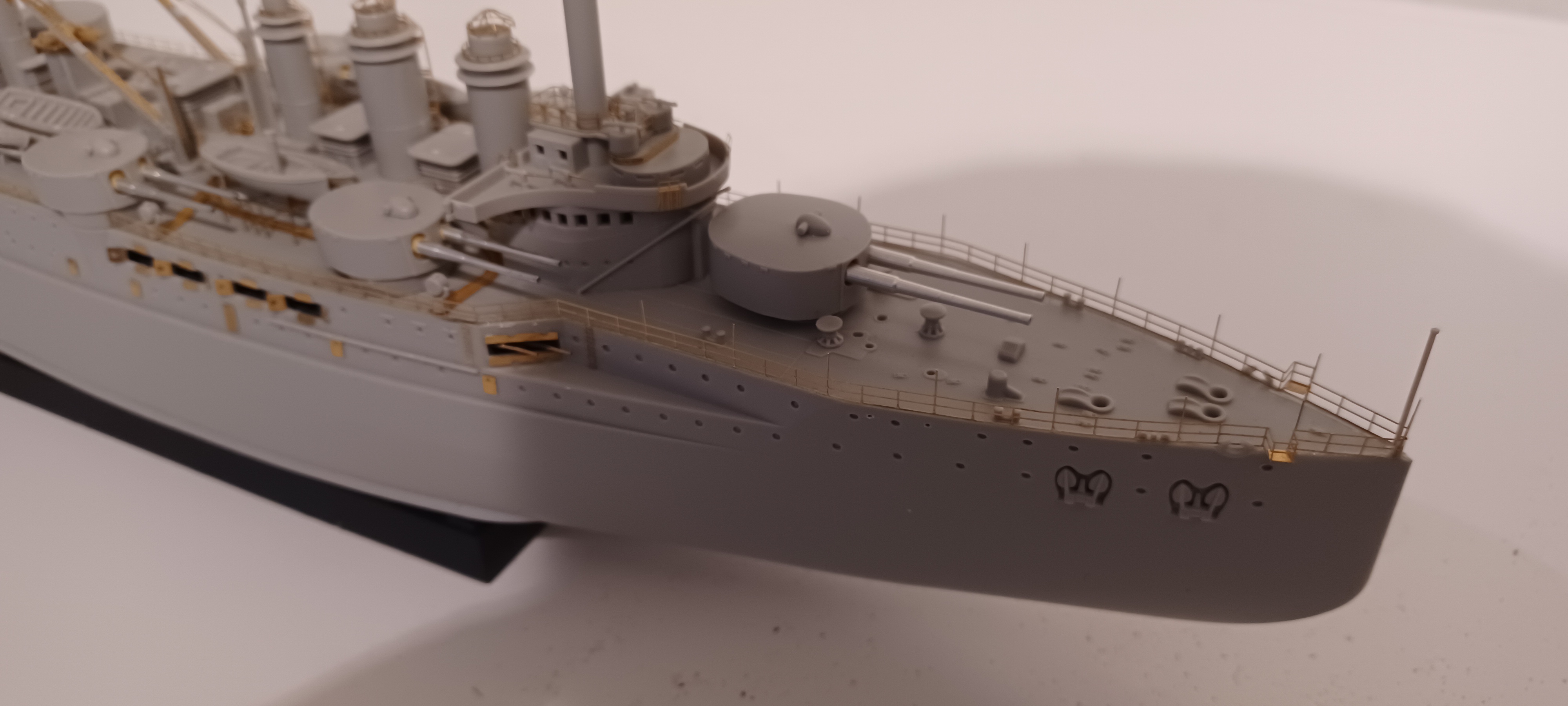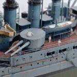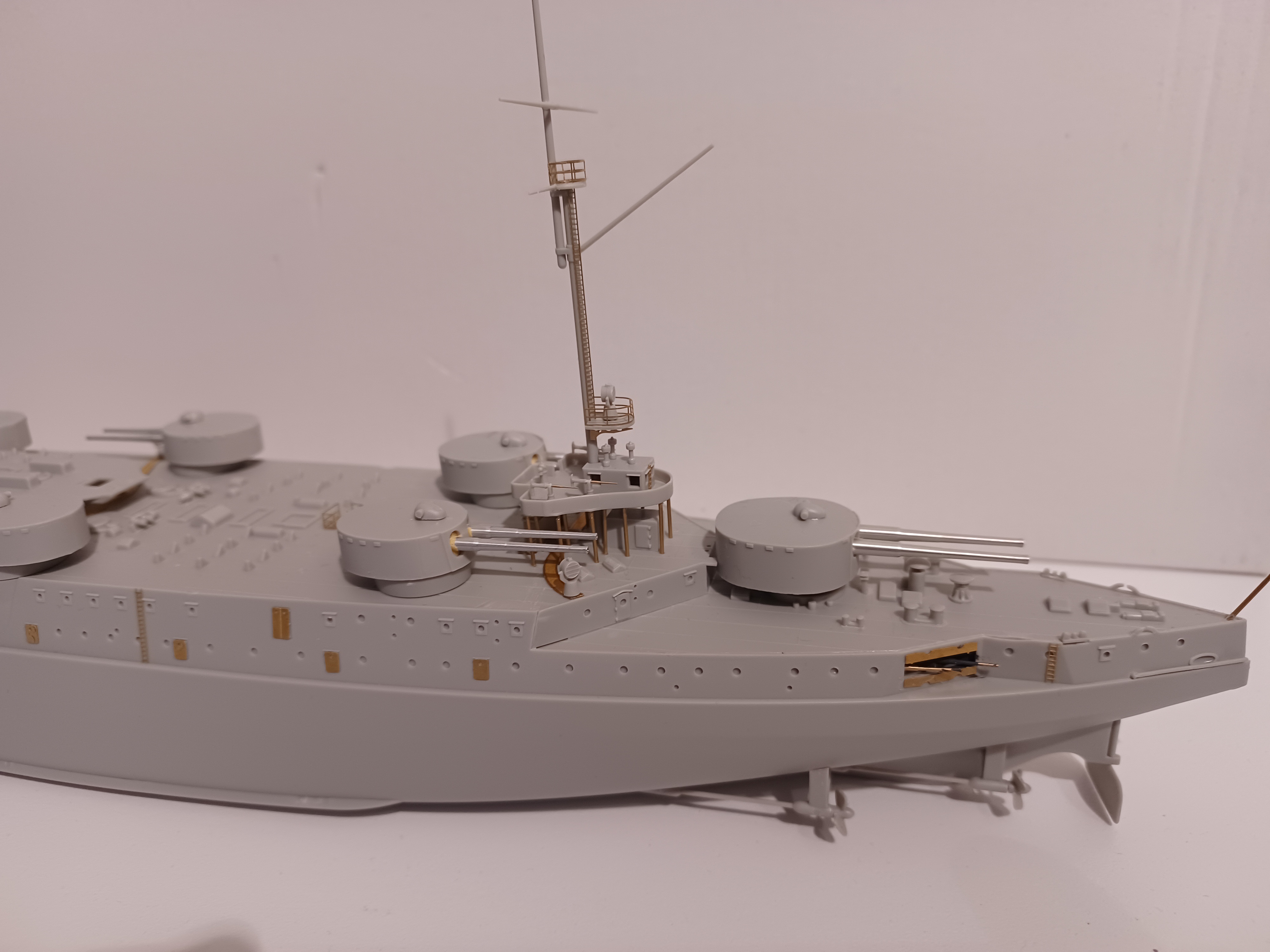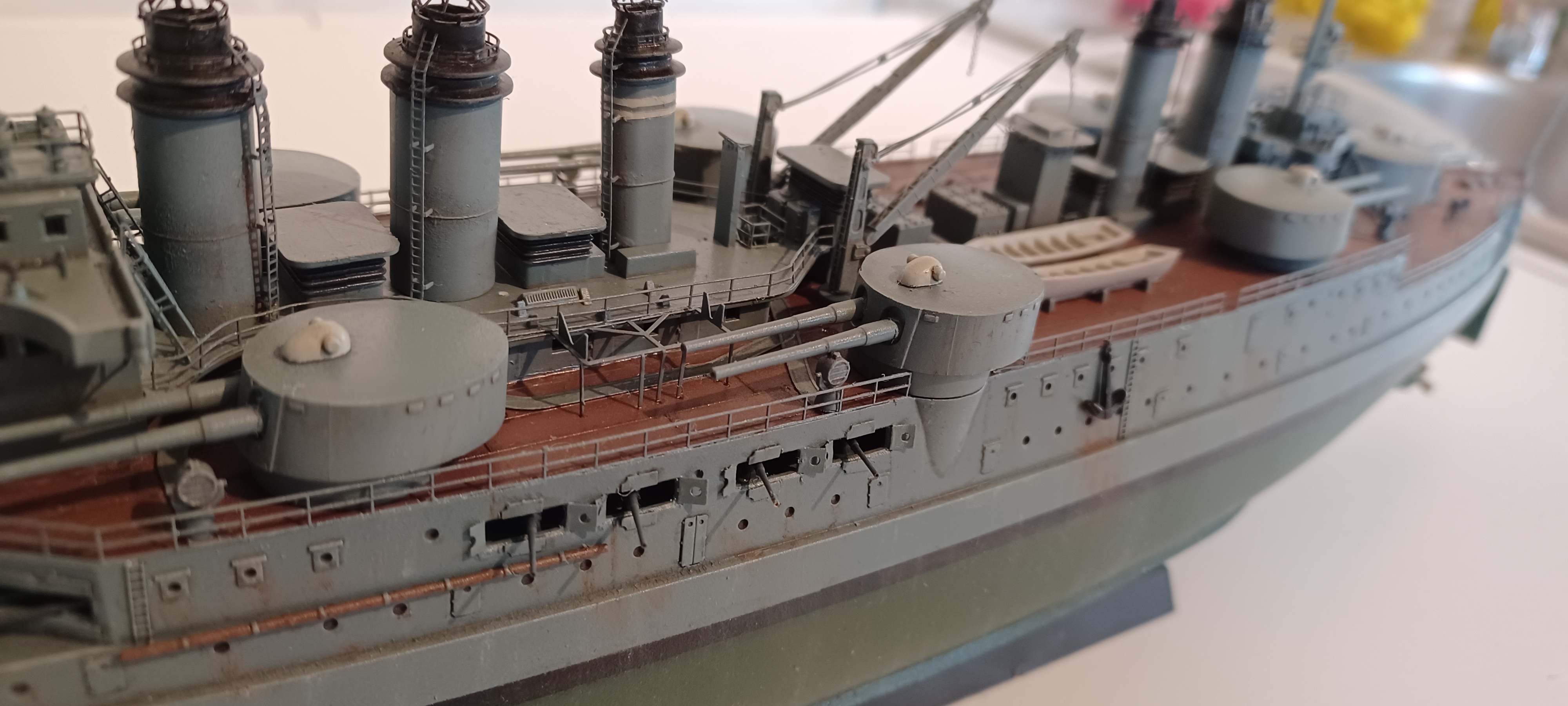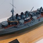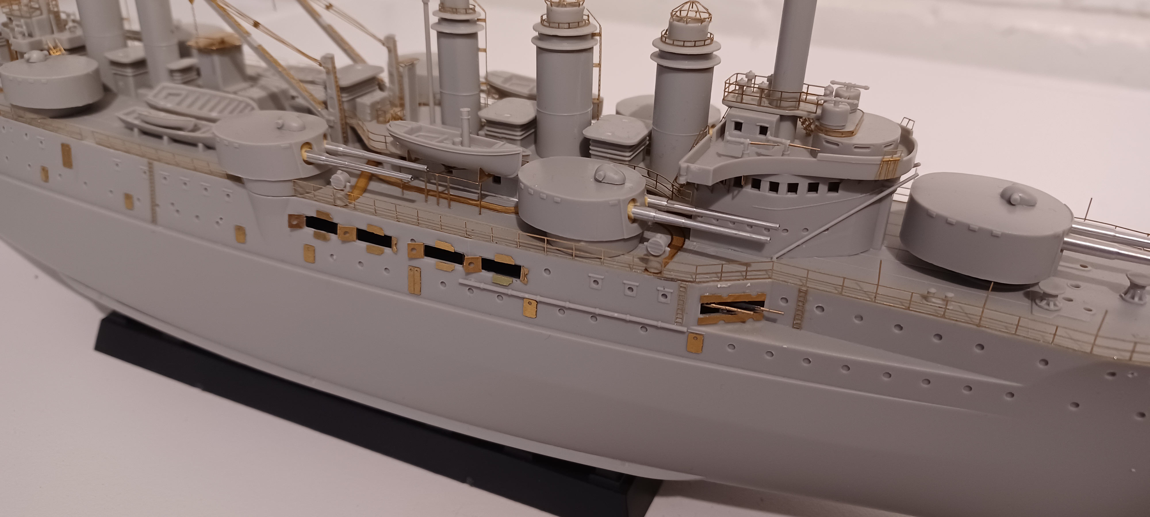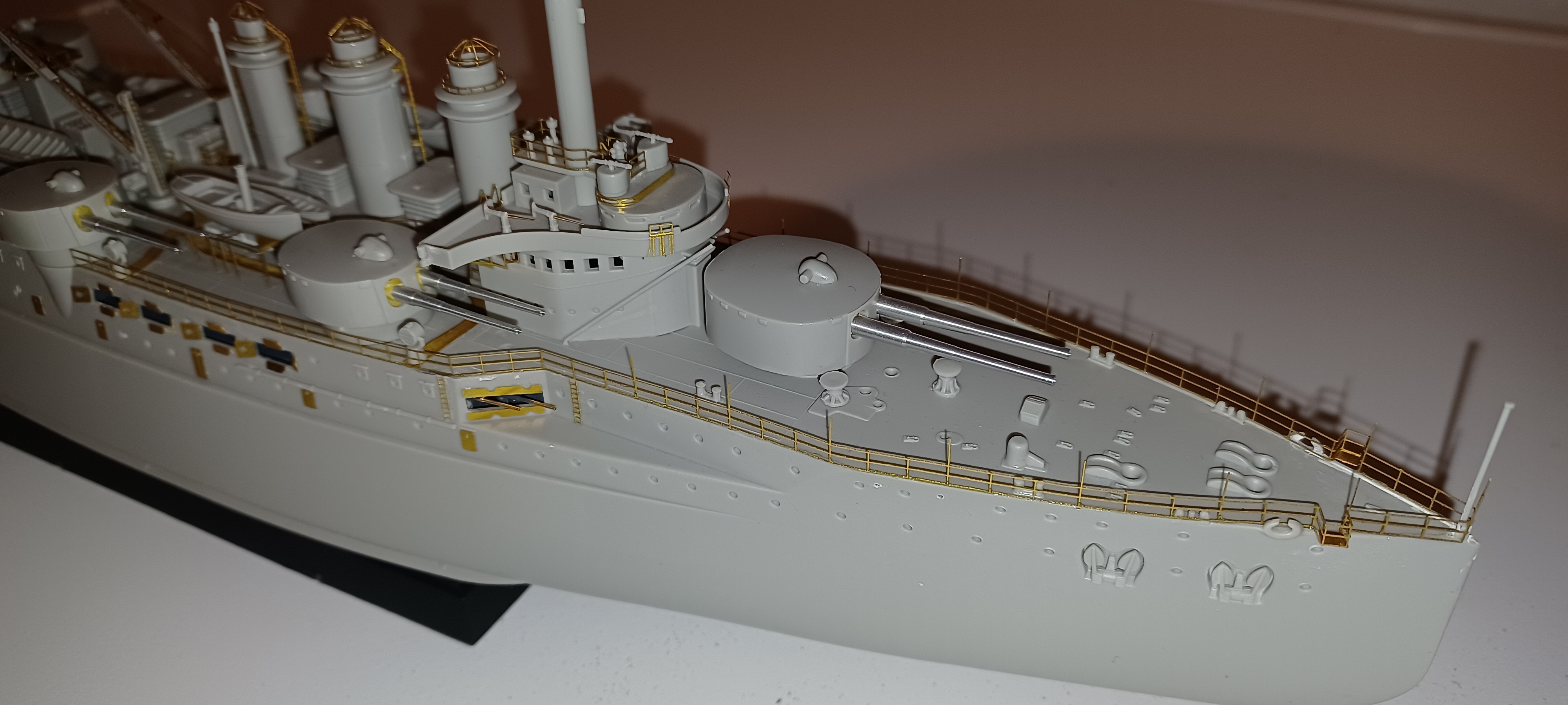 De bouw verliep vlot en extra details worden geaccentueerd door de bijgeleverde PE sets. Niet alle onderdelen werden direct vastgelijmd om in het latere stadium het verven en verweren te vereenvoudigen. Zo schilderde ik de schoorstenen, reddingsboten en geschutstorens apart en werden deze maar op het einde toegevoegd. Zelfs ongeschilderd ziet het model er al indrukwekkend uit met alle PE en de metalen lopen.