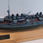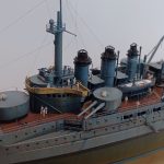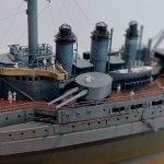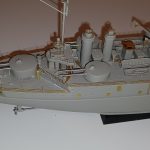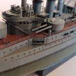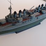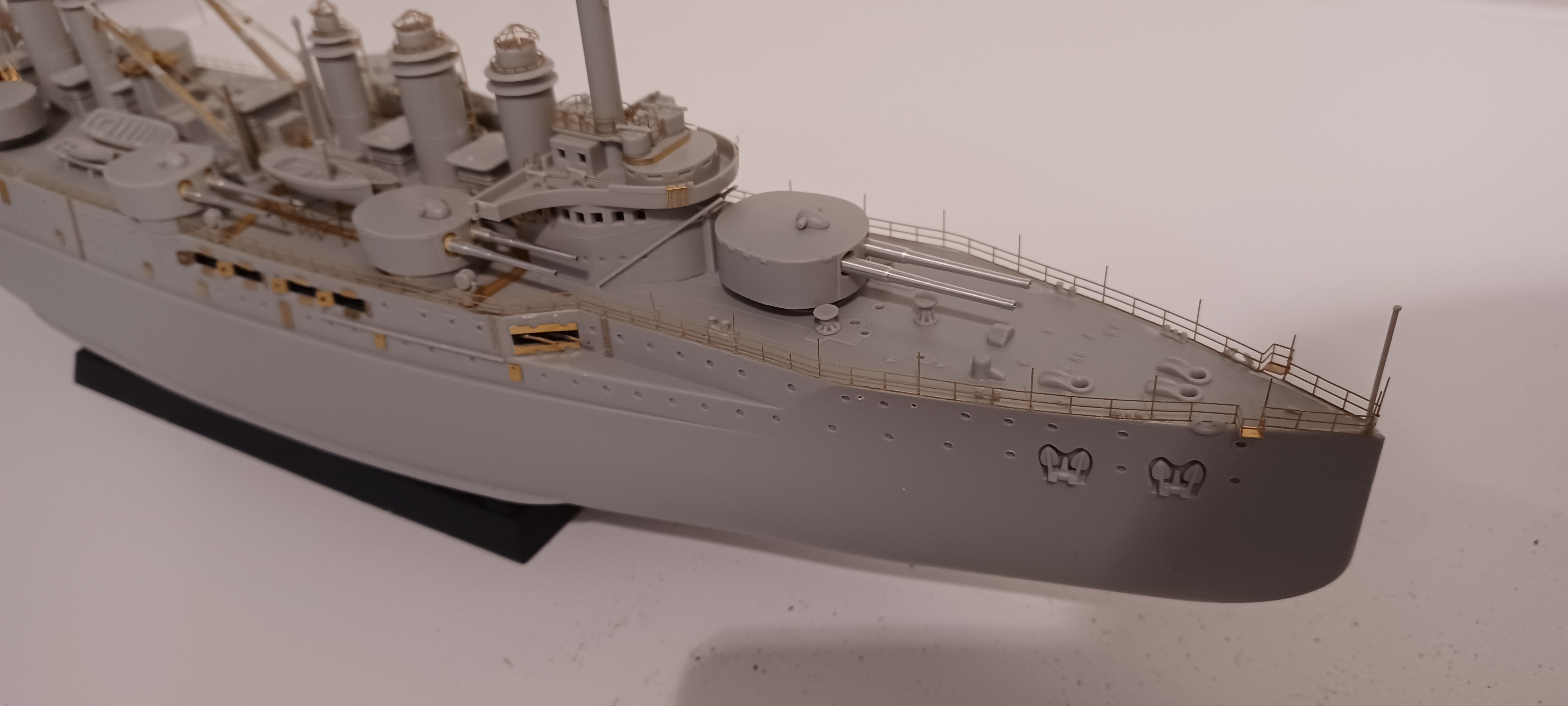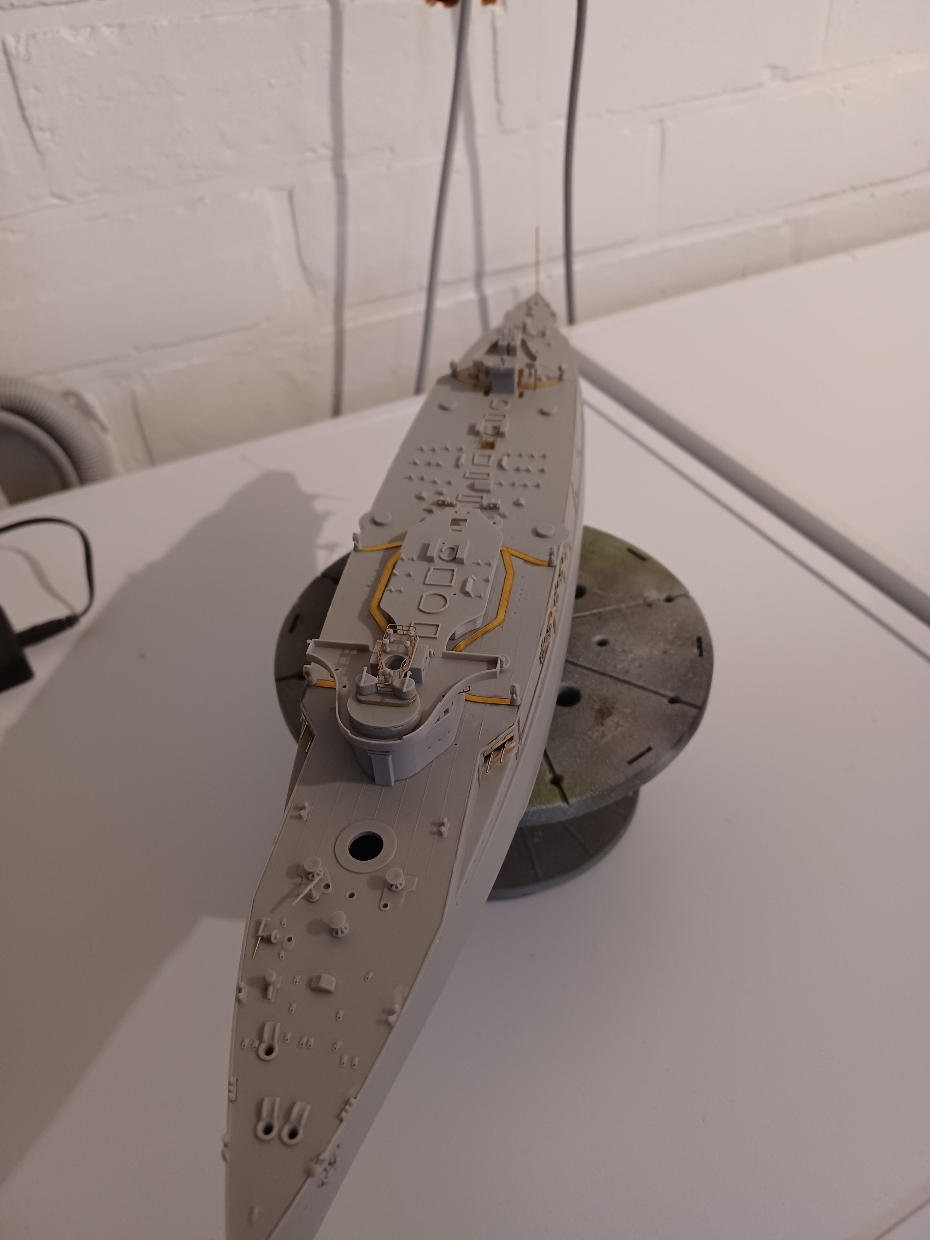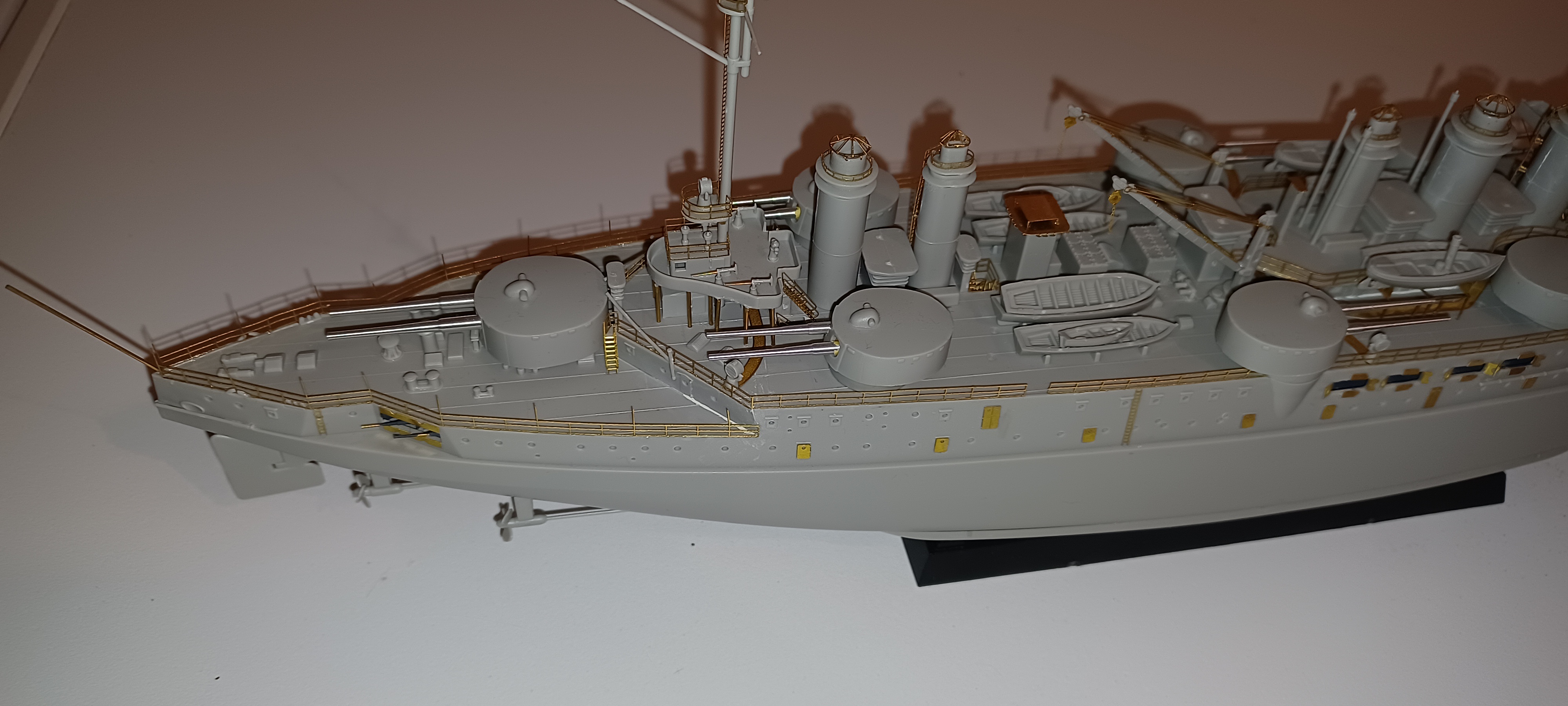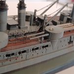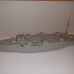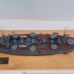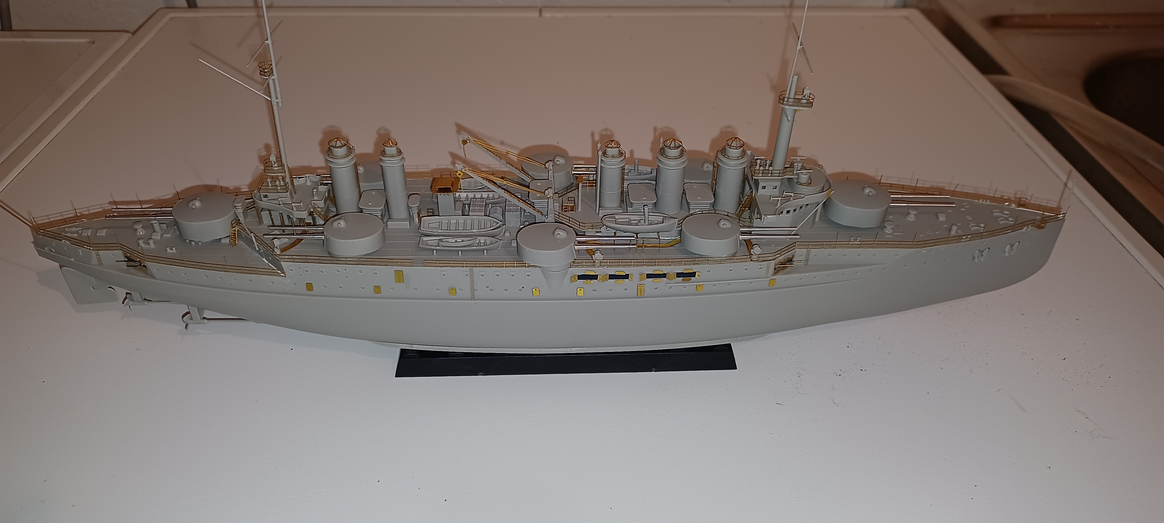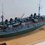 De bouw verliep vlot en extra details worden geaccentueerd door de bijgeleverde PE sets. Niet alle onderdelen werden direct vastgelijmd om in het latere stadium het verven en verweren te vereenvoudigen. Zo schilderde ik de schoorstenen, reddingsboten en geschutstorens apart en werden deze maar op het einde toegevoegd. Zelfs ongeschilderd ziet het model er al indrukwekkend uit met alle PE en de metalen lopen.