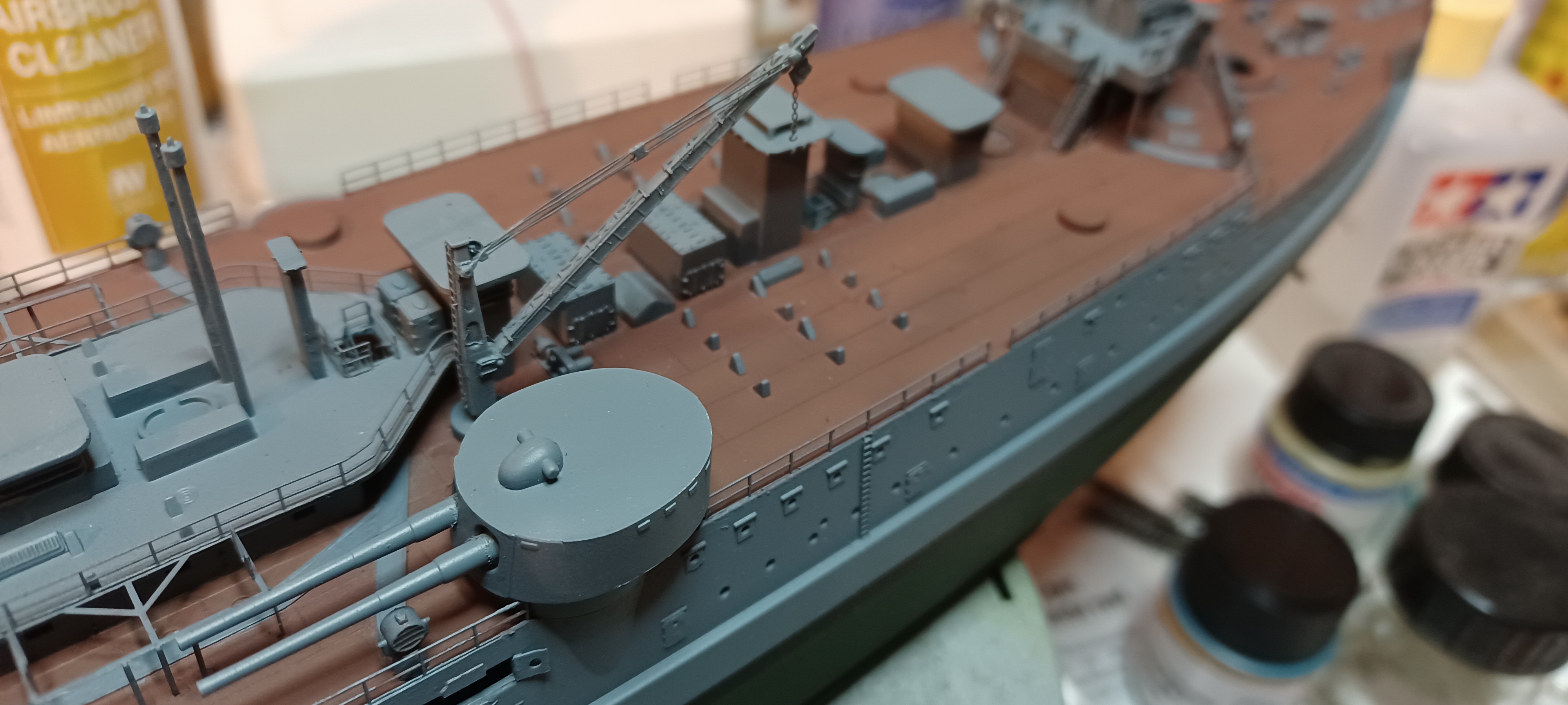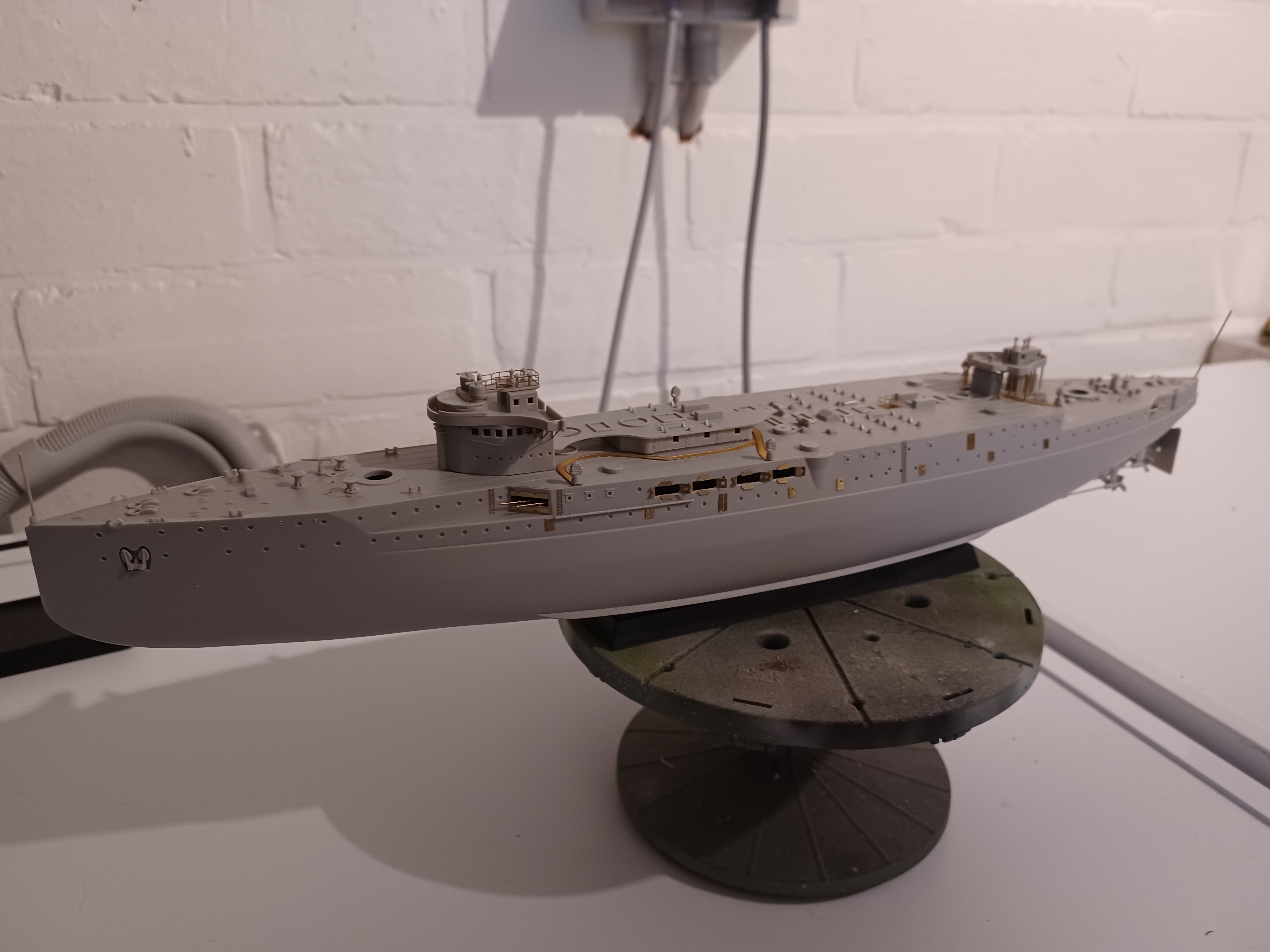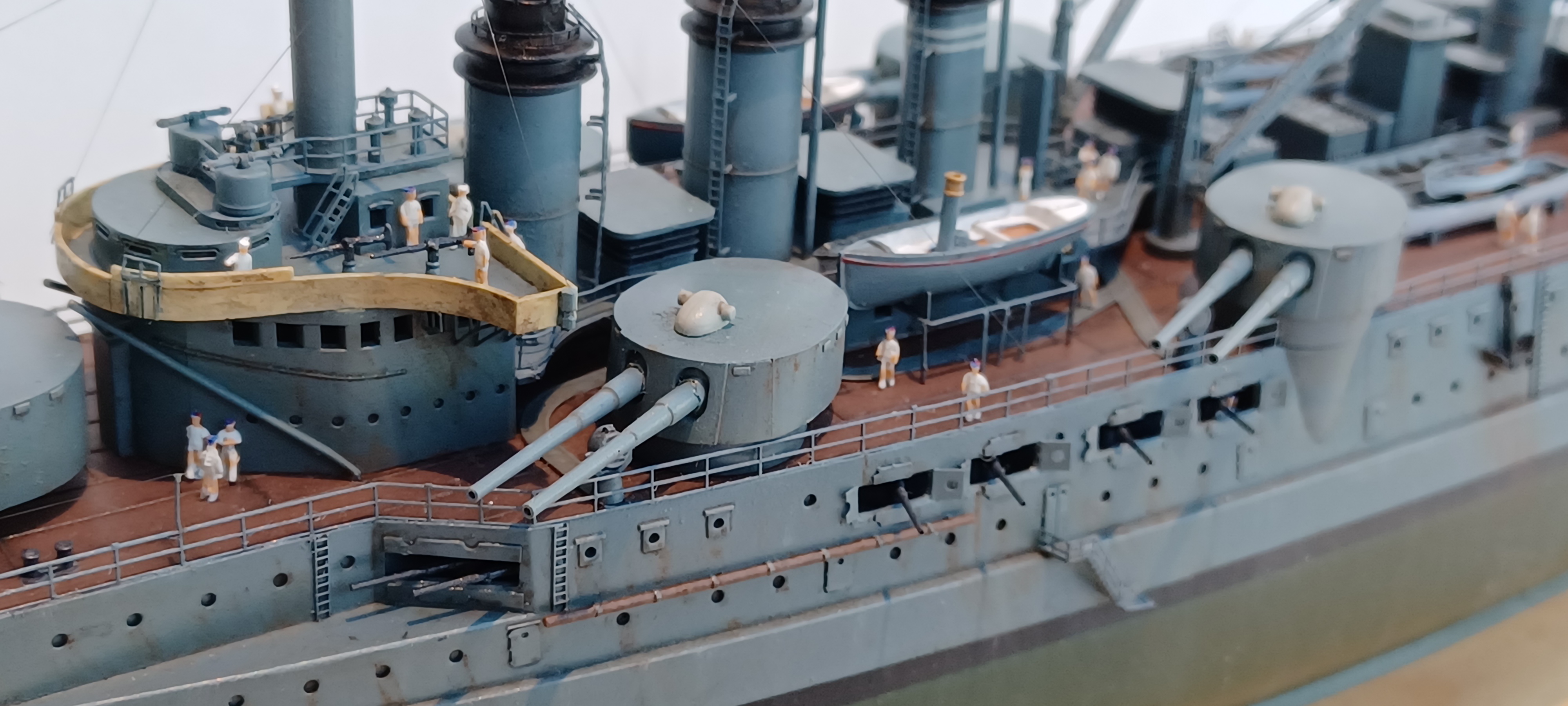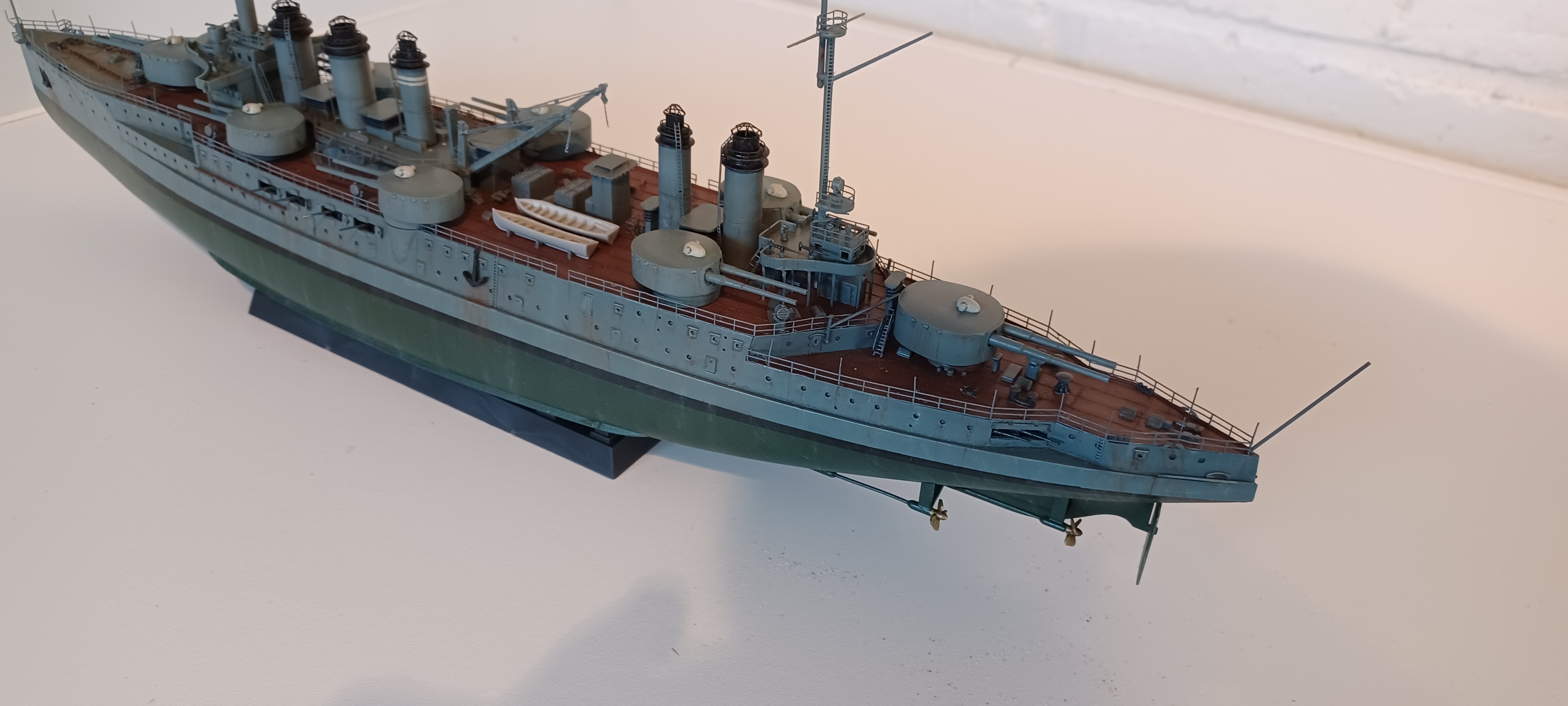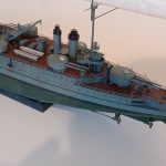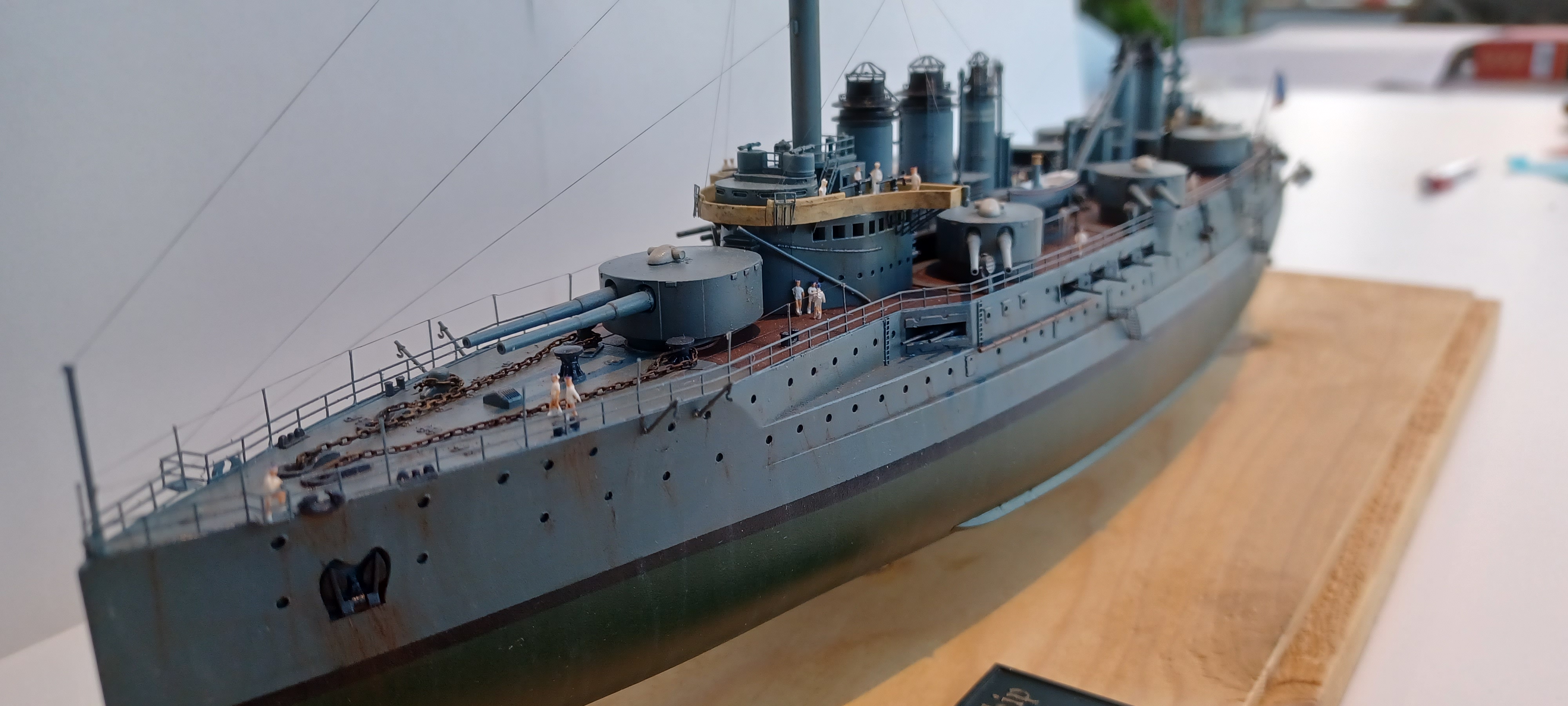 De bouw verliep vlot en extra details worden geaccentueerd door de bijgeleverde PE sets. Niet alle onderdelen werden direct vastgelijmd om in het latere stadium het verven en verweren te vereenvoudigen. Zo schilderde ik de schoorstenen, reddingsboten en geschutstorens apart en werden deze maar op het einde toegevoegd. Zelfs ongeschilderd ziet het model er al indrukwekkend uit met alle PE en de metalen lopen.