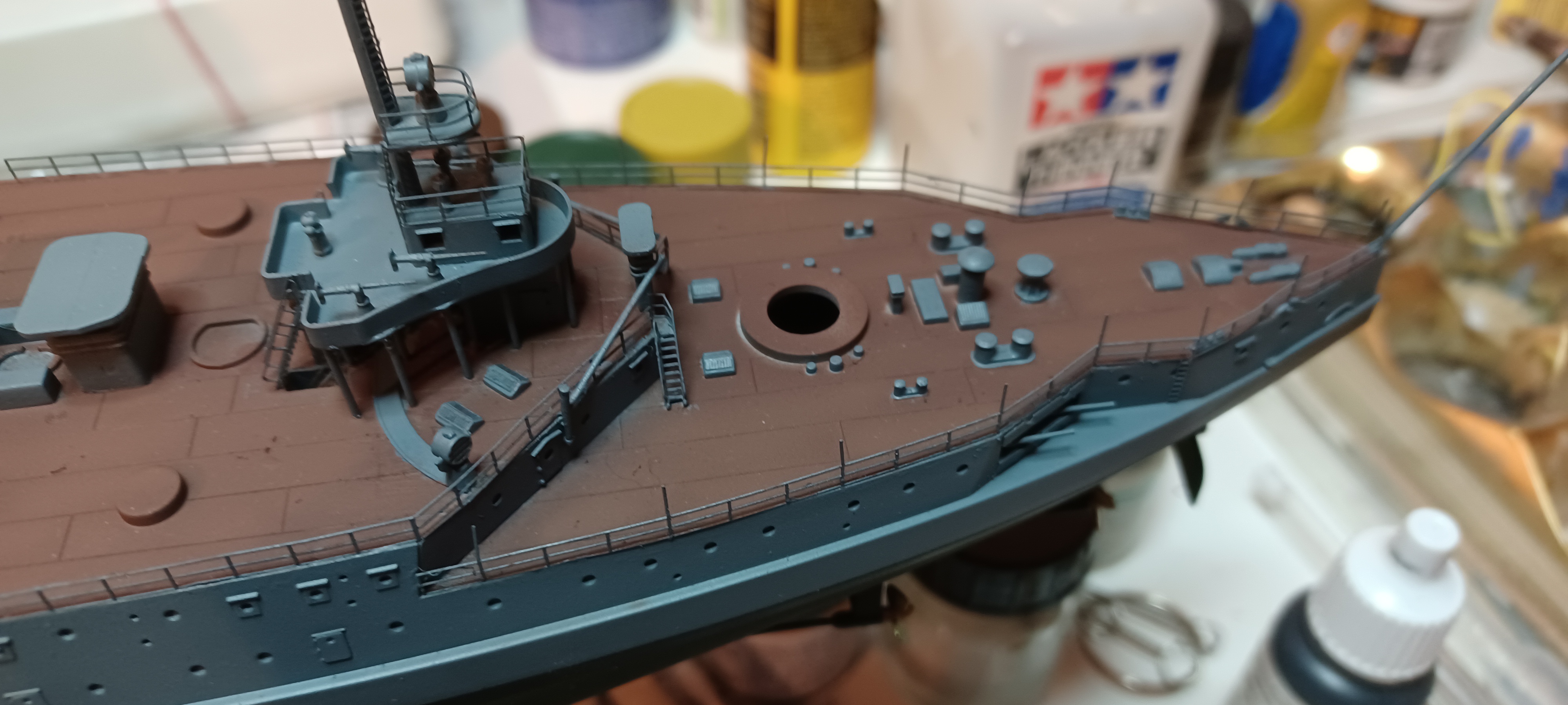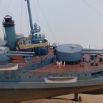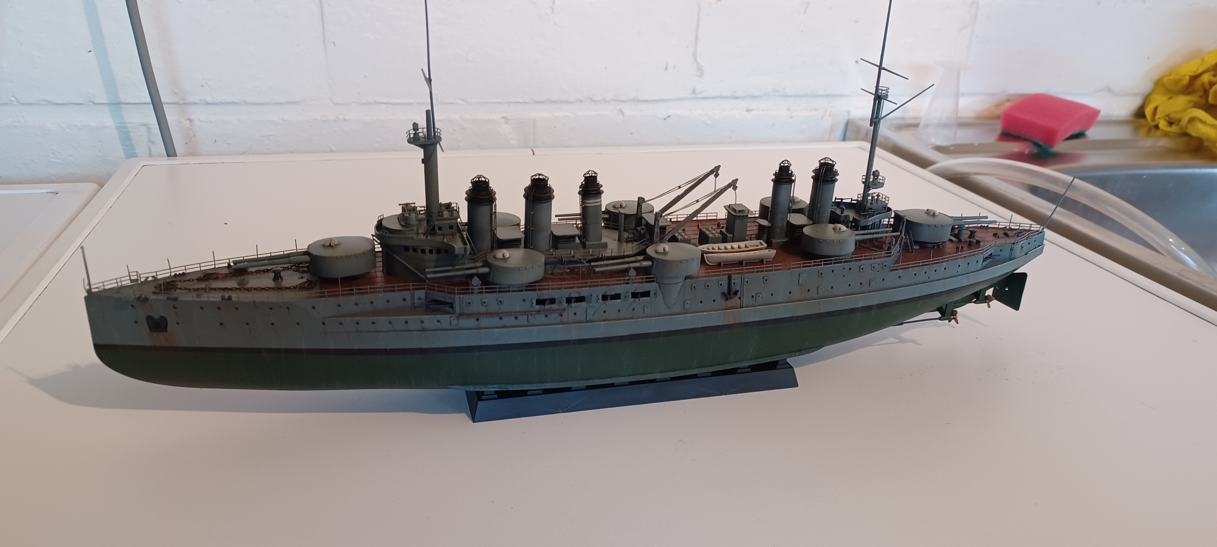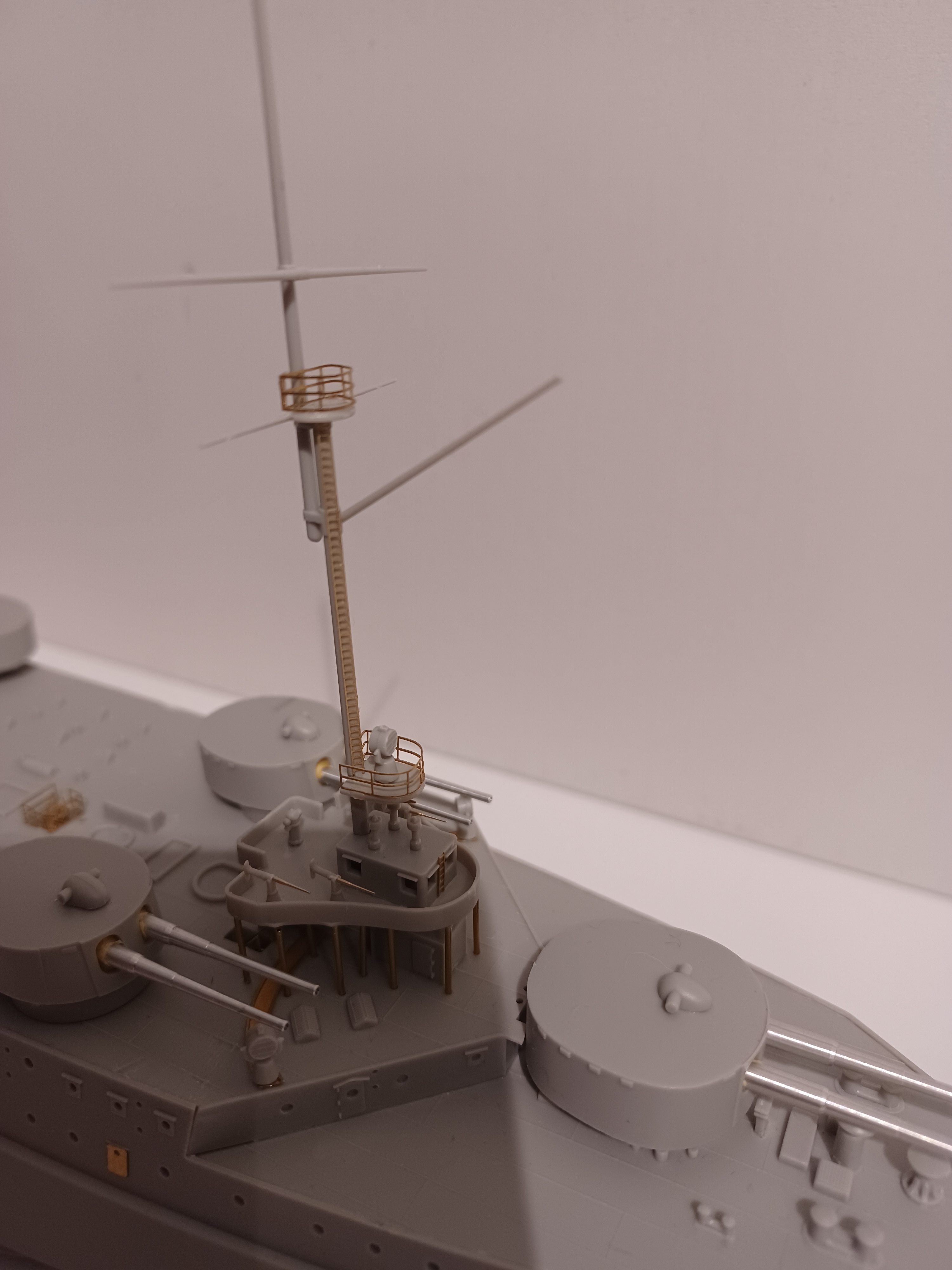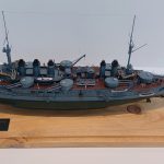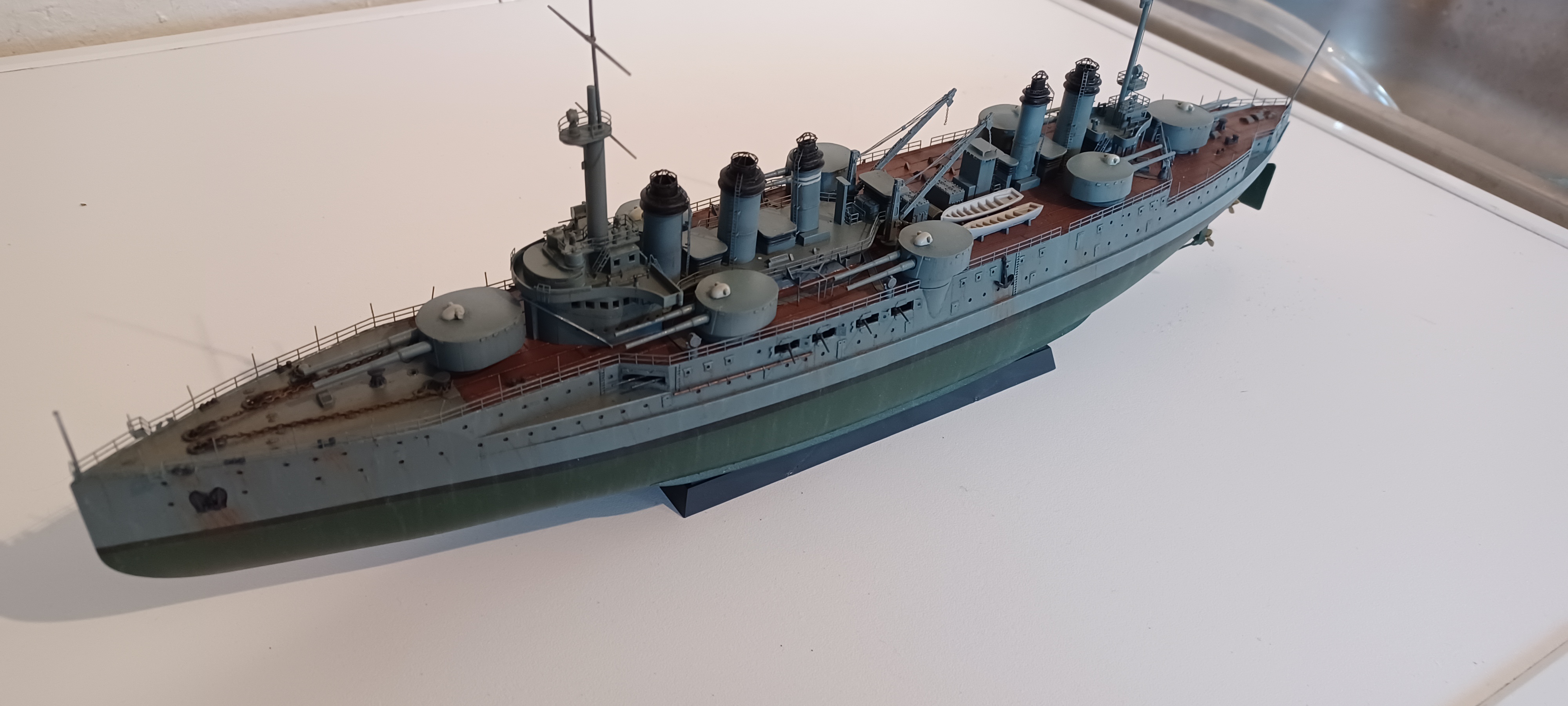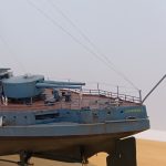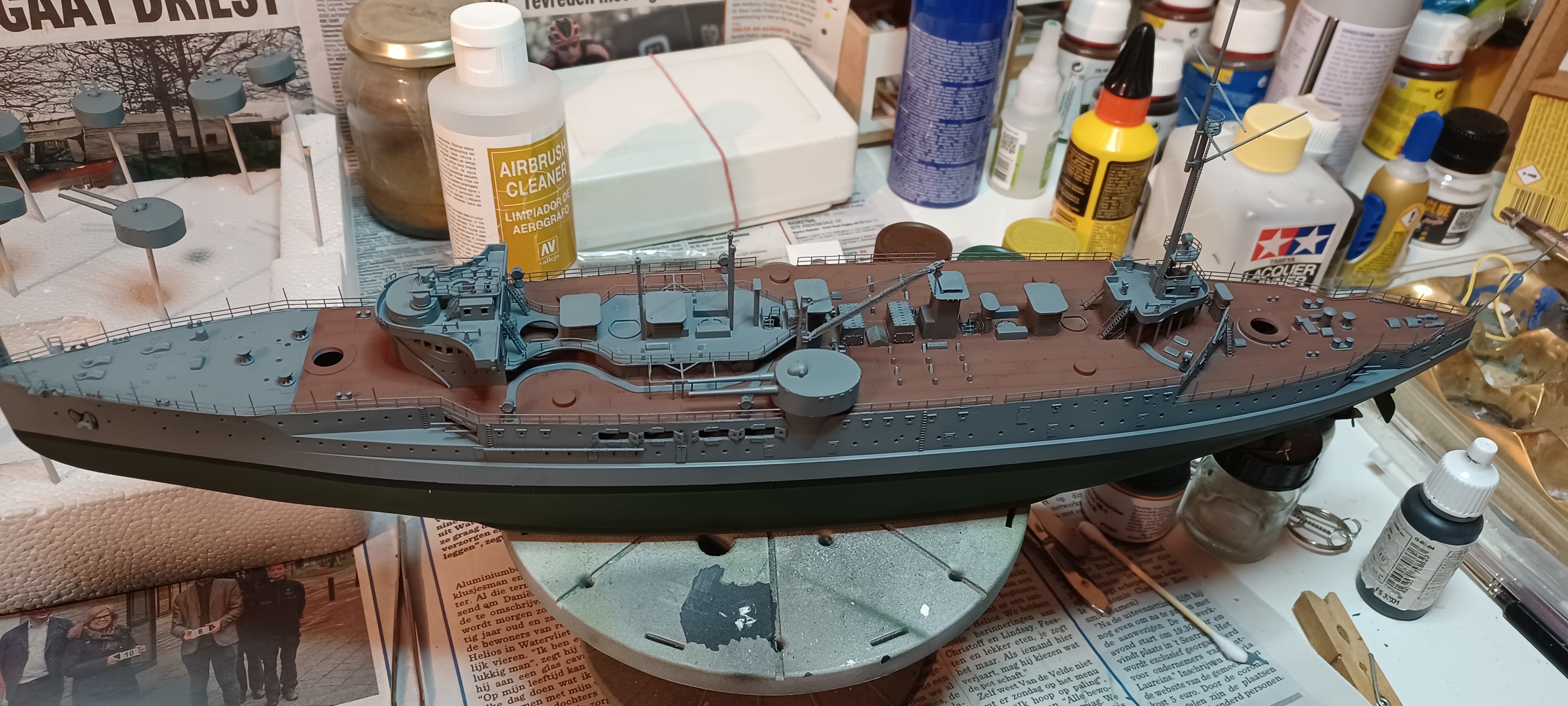 De bouw verliep vlot en extra details worden geaccentueerd door de bijgeleverde PE sets. Niet alle onderdelen werden direct vastgelijmd om in het latere stadium het verven en verweren te vereenvoudigen. Zo schilderde ik de schoorstenen, reddingsboten en geschutstorens apart en werden deze maar op het einde toegevoegd. Zelfs ongeschilderd ziet het model er al indrukwekkend uit met alle PE en de metalen lopen.