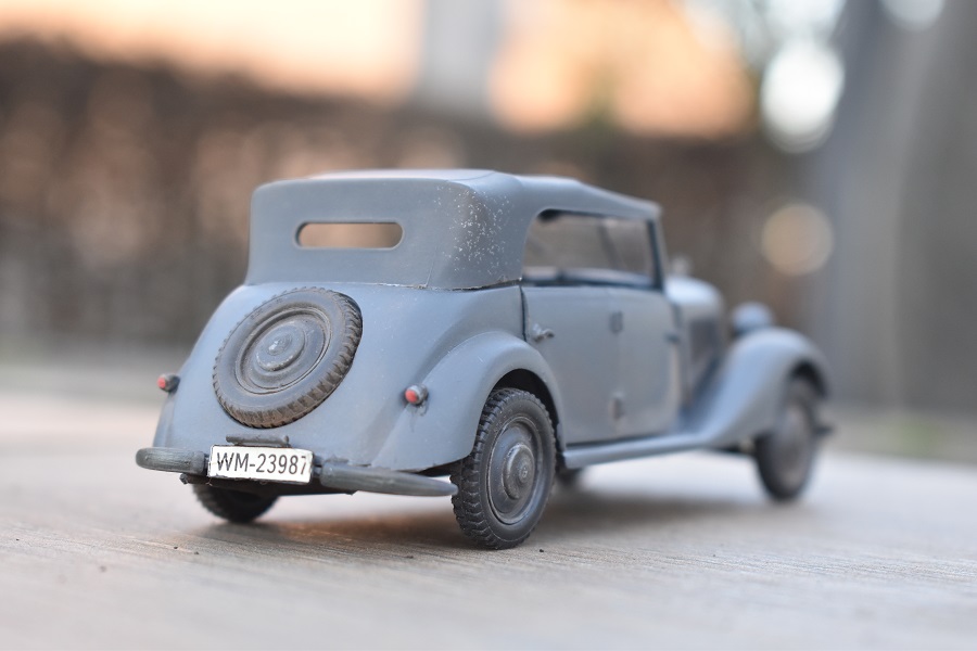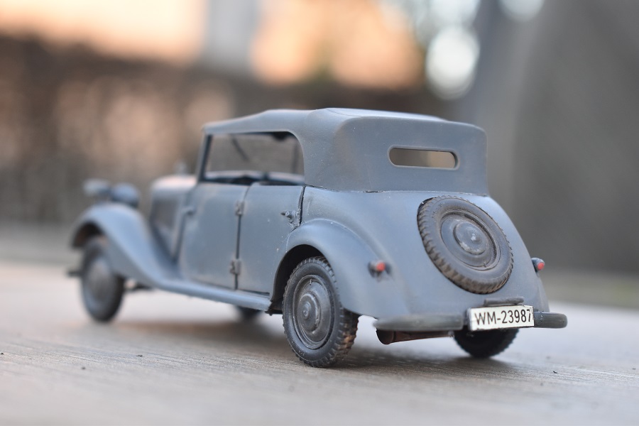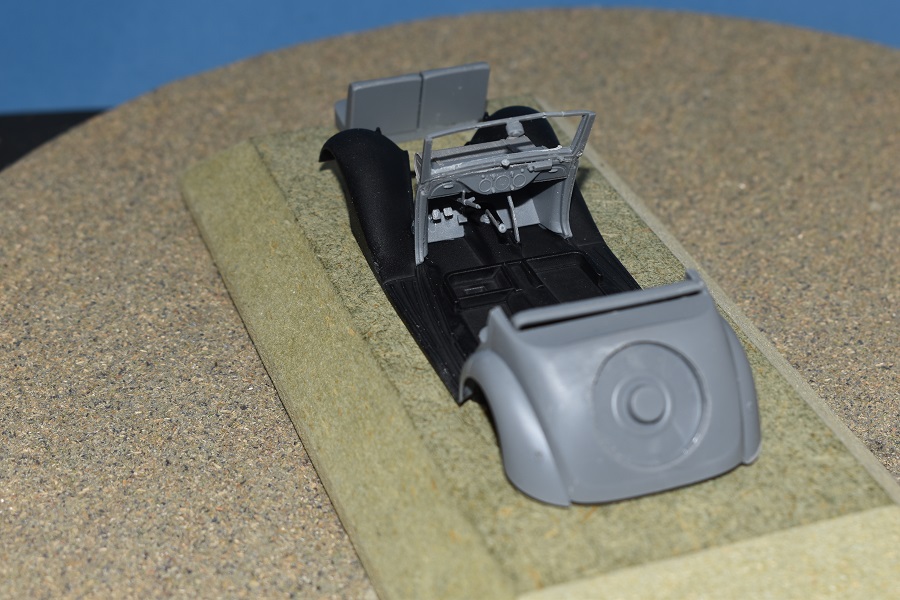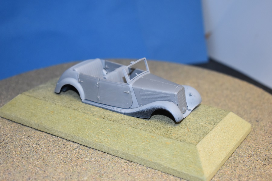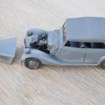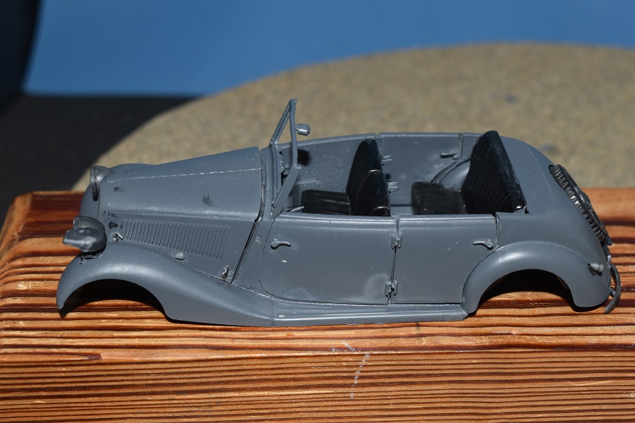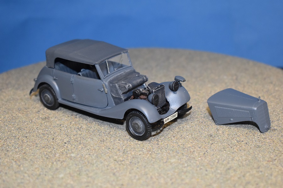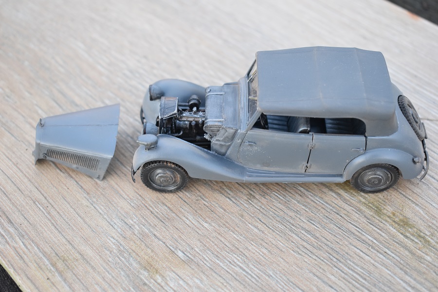 Om reden dat ik de motor niet voorzien had van bekabeling, besloot ik de motorkap gesloten te monteren maar die wel nog in zijn geheel afneembaar te maken. Hiermee behield ik ook de stevigheid van de motorkap welke anders nogal fragiel zou kunnen zijn. Een grijze primer bracht nog enkele fouten aan het licht die dienden bijgewerkt te worden. De carrosserie werd vervolgens gespoten in Tamiya TS-4 German Grey (spuitbus) maar na het drogen bleken er vlekken voor te komen aan de onderzijde van de portieren vooraan. Lichtjes opschuren en een nieuwe laag verf loste dit probleem op. Het is raar dat dit enkel voorkwam op de voorste portieren en niet op de rest van het voertuig. Ondertussen was ook het chassis volledig afgewerkt door de plaatsing van de wielen. Het huwelijk tussen body en chassis verliep goed en de afneembare motorkap bleek een goed idee. Noteer wel dat ik de motorkap en de radiatorgrille als 1 stuk verlijmd heb. Had de radiatorgrille gewoon op de body blijven staan, dan zou de aansluiting nooit mooi geweest zijn. Uiteindelijk was het tijd om het canvas dak te plaatsen waarbij ik dus voor de gesloten versie koos. De reden hiervoor is het feit dat ik een bijna zelfde kit heb maar van het merk MiniArt en die wil ik dan wel ooit eens in een open versie bouwen. Het dak vroeg enkel een kleine aanpassing achteraan maar verder zonder problemen. Omwille van een beetje kleurcontrast besloot ik het dak in een iets donkerder grijs te schilderen.