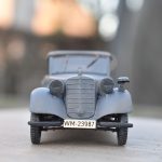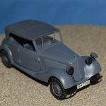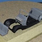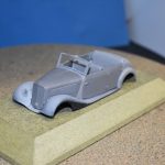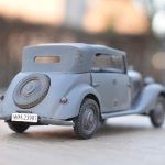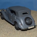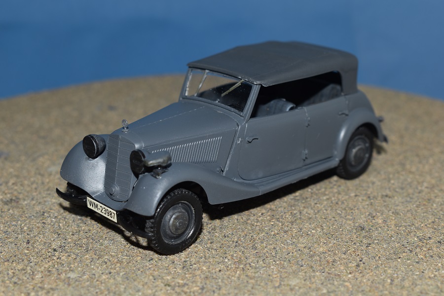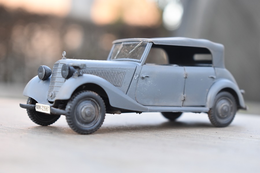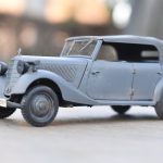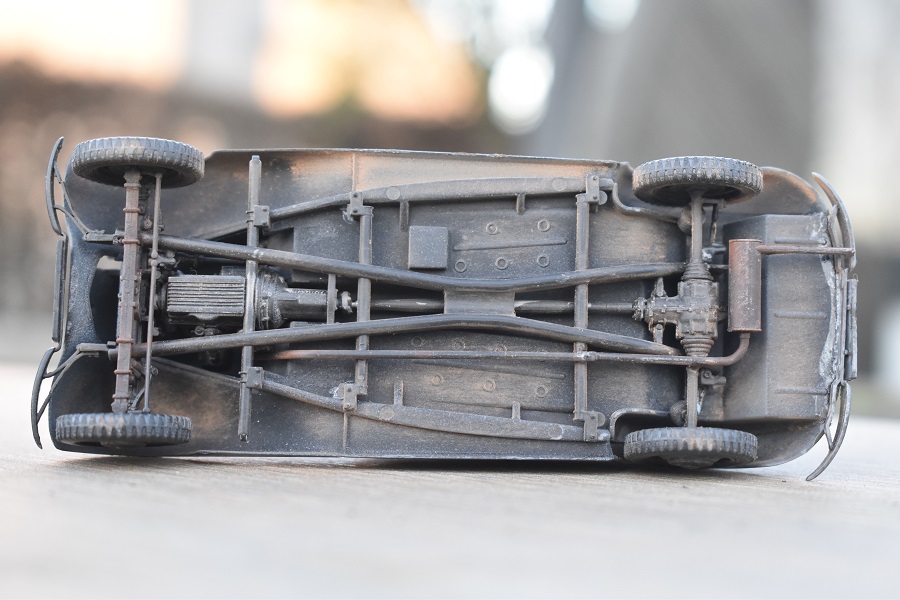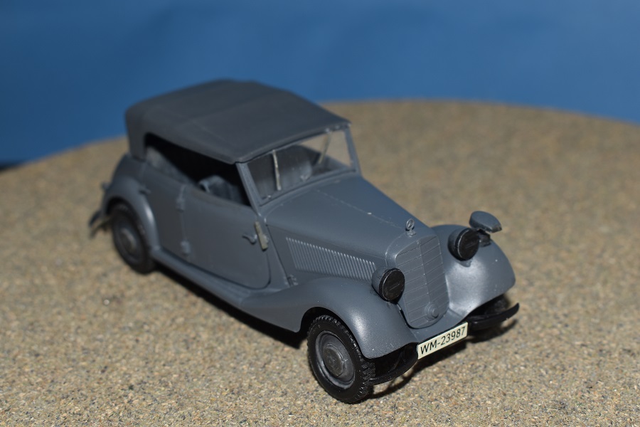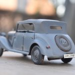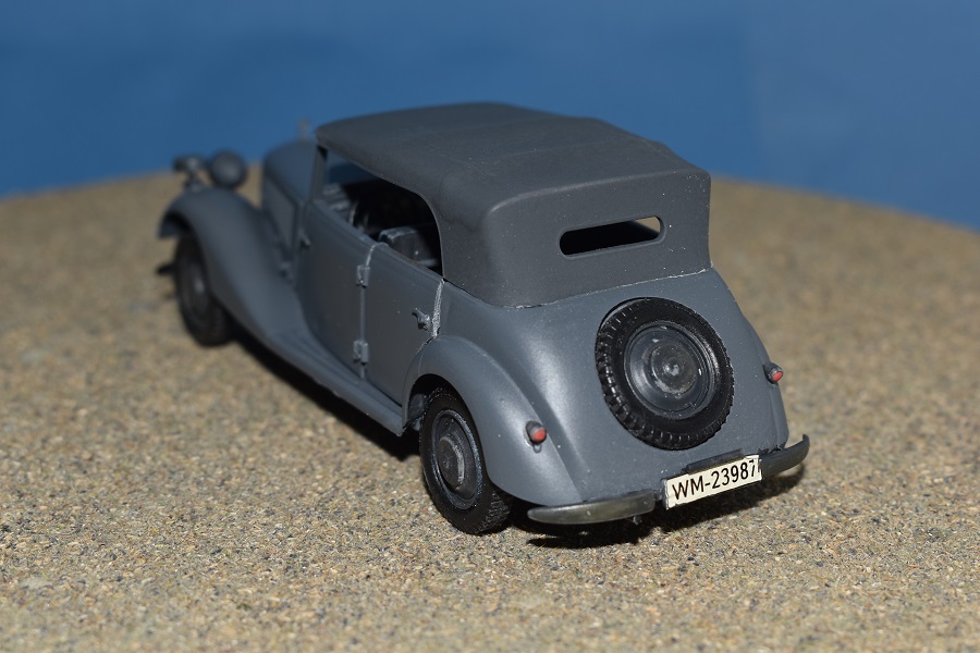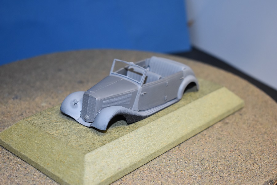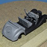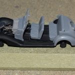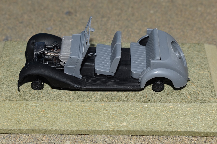Om reden dat ik de motor niet voorzien had van bekabeling, besloot ik de motorkap gesloten te monteren maar die wel nog in zijn geheel afneembaar te maken. Hiermee behield ik ook de stevigheid van de motorkap welke anders nogal fragiel zou kunnen zijn. Een grijze primer bracht nog enkele fouten aan het licht die dienden bijgewerkt te worden. De carrosserie werd vervolgens gespoten in Tamiya TS-4 German Grey (spuitbus) maar na het drogen bleken er vlekken voor te komen aan de onderzijde van de portieren vooraan. Lichtjes opschuren en een nieuwe laag verf loste dit probleem op. Het is raar dat dit enkel voorkwam op de voorste portieren en niet op de rest van het voertuig. Ondertussen was ook het chassis volledig afgewerkt door de plaatsing van de wielen. Het huwelijk tussen body en chassis verliep goed en de afneembare motorkap bleek een goed idee. Noteer wel dat ik de motorkap en de radiatorgrille als 1 stuk verlijmd heb. Had de radiatorgrille gewoon op de body blijven staan, dan zou de aansluiting nooit mooi geweest zijn. Uiteindelijk was het tijd om het canvas dak te plaatsen waarbij ik dus voor de gesloten versie koos. De reden hiervoor is het feit dat ik een bijna zelfde kit heb maar van het merk MiniArt en die wil ik dan wel ooit eens in een open versie bouwen. Het dak vroeg enkel een kleine aanpassing achteraan maar verder zonder problemen. Omwille van een beetje kleurcontrast besloot ik het dak in een iets donkerder grijs te schilderen.