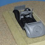 Ik koos voor die laatste en monteerde die tegen het brandschot welke het motorcompartiment afschermt van de rest van het voertuig. Er is detail voorzien voor het dashboard en bestuurdersruimte. De 4 portieren krijgen ook details onder vorm van deurklinken binnen en buiten maar ik ondervond dat de fit van de achterste portieren te wensen over liet en diende dus enkele aanpassingen te verrichten. De zetels pasten perfect.