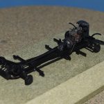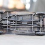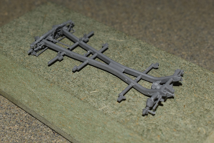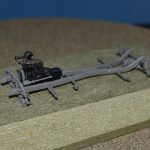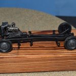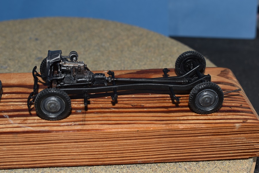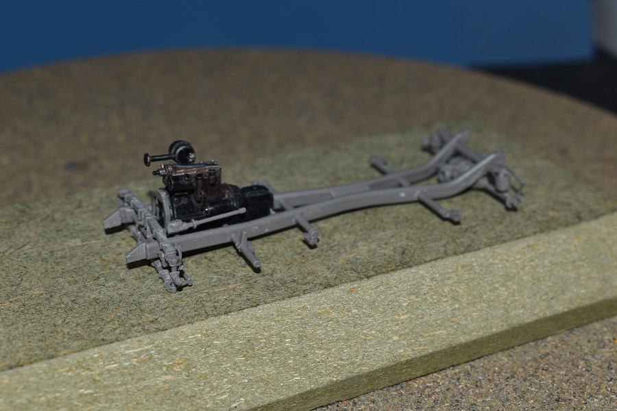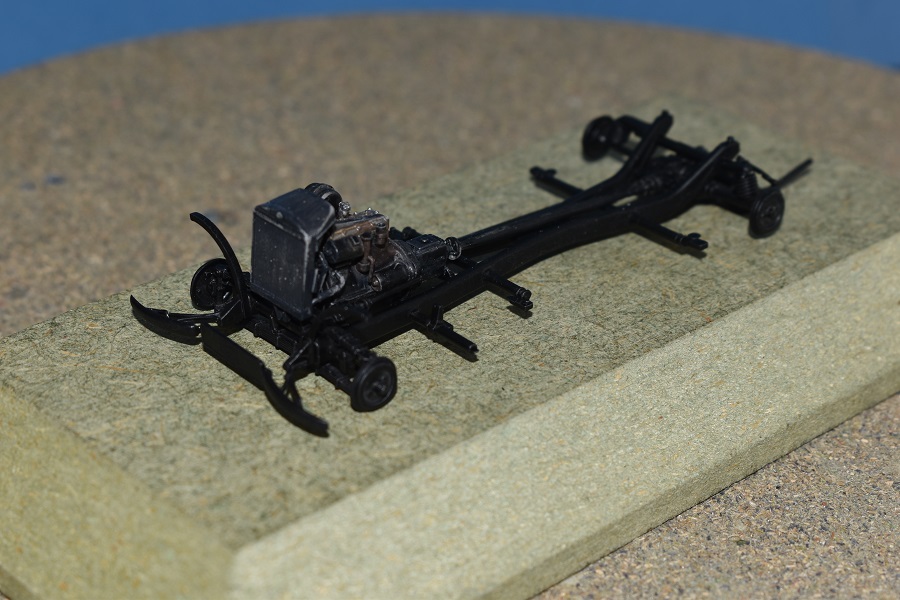 Deze start zoals dikwijls met de motor maar men geeft geen kleurindicaties. Na wat opzoekwerk schilderde ik het blok zwart (spuitbus Spectrum) met een metaalkleurig kleppendeksel (AK Real Colour Markers). De uitlaat gaf ik een lichte roestkleur mee (poeder). De volgende fase betreft de bouw van het chassis wat eveneens vlot verloopt als je de onderdelen heel voorzichtig losmaakt en opkuist. Er waren enkele breuken bij onderdelen op de sprues zelf en deze dienden dus eerst hersteld te worden. Na een grijze primer (spuitbus Spectrum) kon een dryfit met de motor: Eens volledig afgewerkt, werd het chassis zwart gespoten. Na deze fase richten we ons op de carrosserie van het voertuig zelf met als begin de keuze tussen een brandstoftank van de eerste types (pré 1939) of de late versie vanaf 1939.