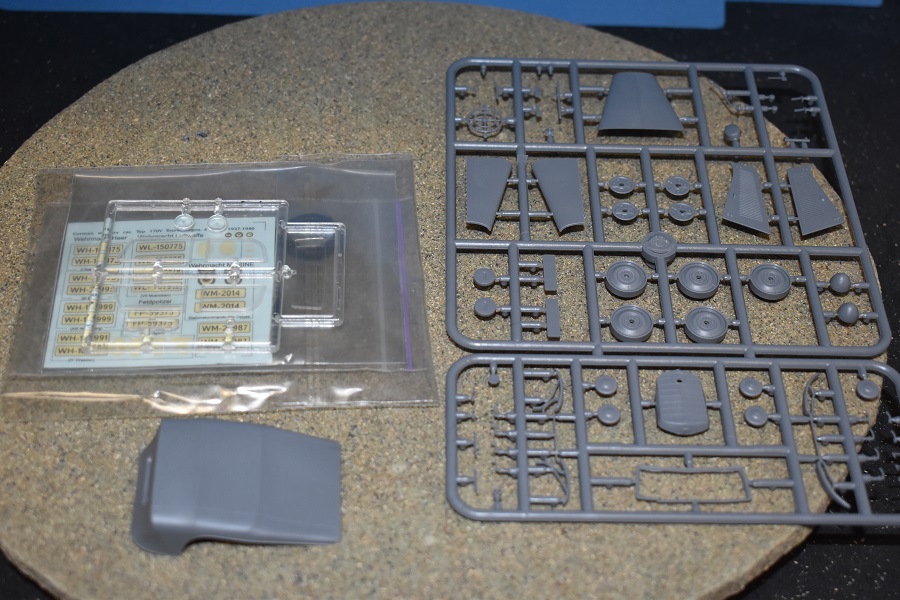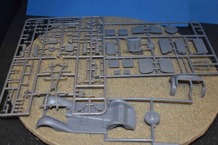 • Er zijn 4 sprues en een afzonderlijk canvas dak in grijze plastiek en 1 doorzichtig.